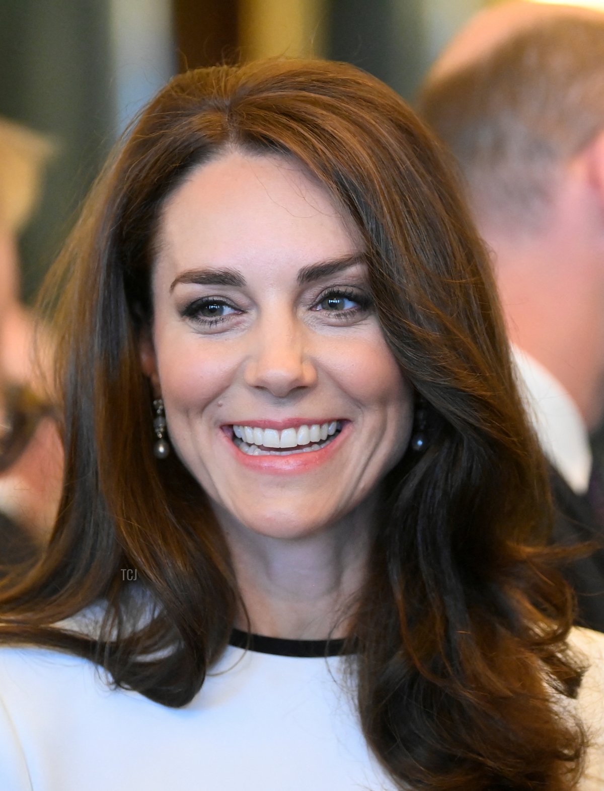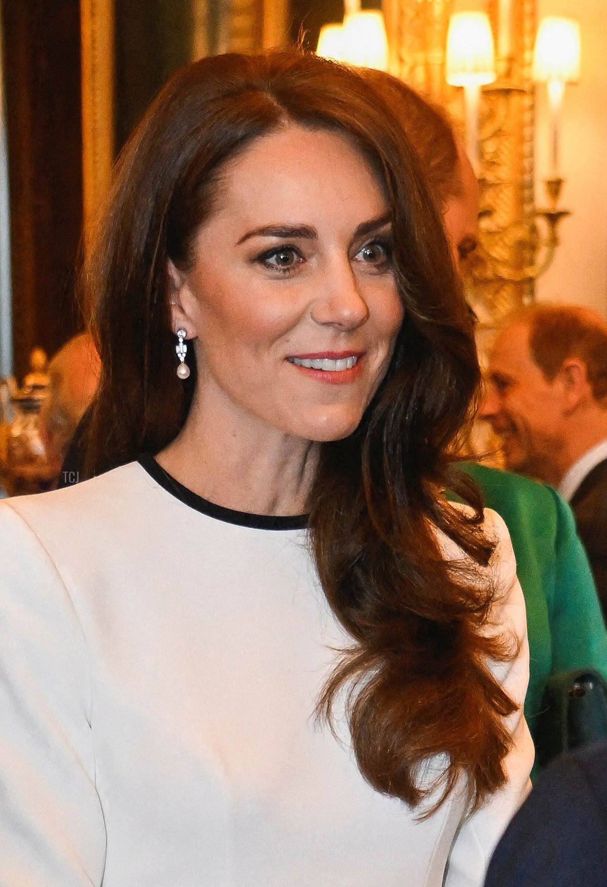 Kate wore black and white for the palace luncheon, accessorized with diamonds and pearls.