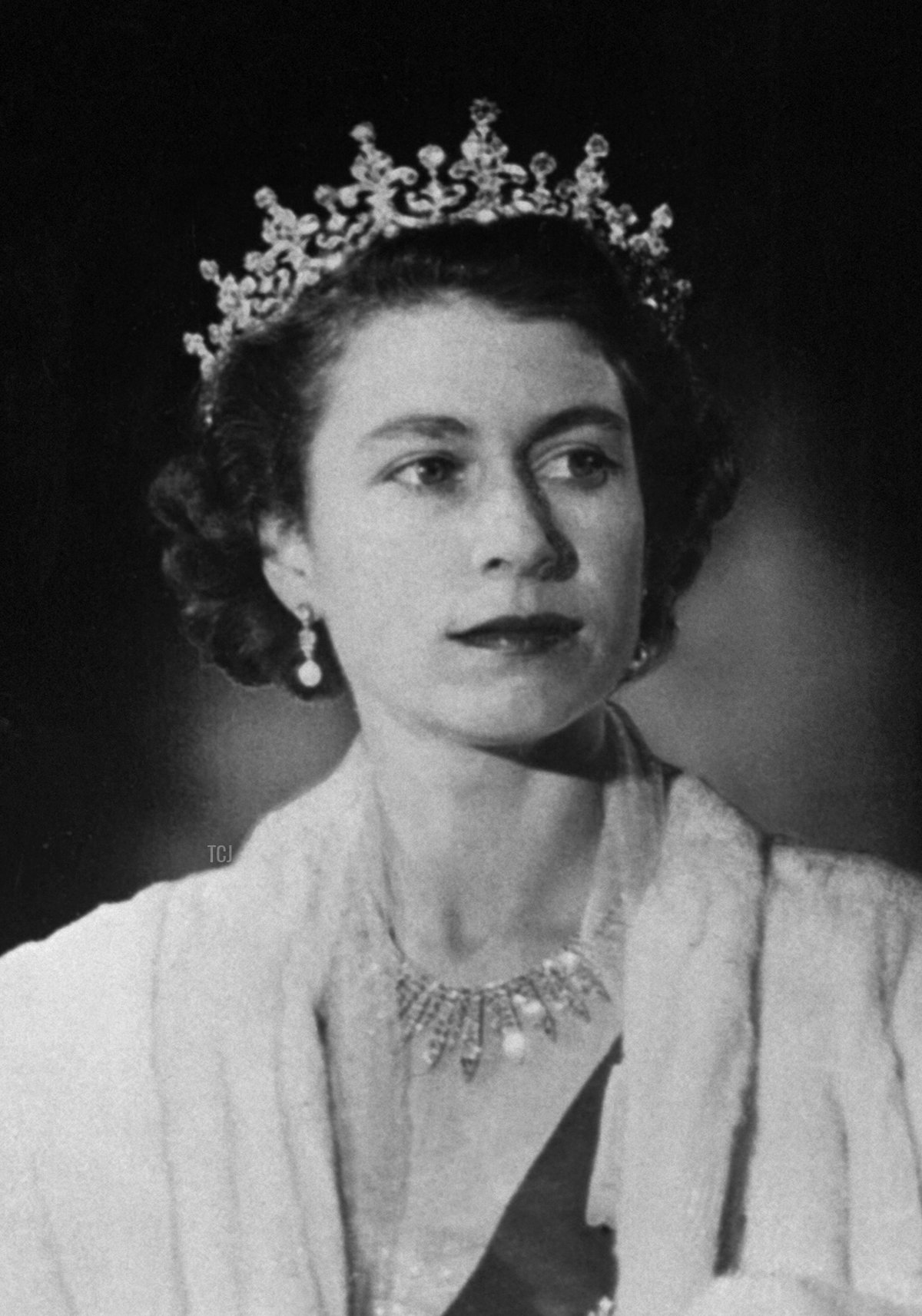 The pearls themselves were wedding gifts to the then-Princess Elizabeth from the Hakim of Bahrain in November 1947. Above, she wears them in Winnipeg during the 1951 tour of Canada, paired with the Girls of Great Britain and Ireland Tiara and the City of London Fringe Necklace.