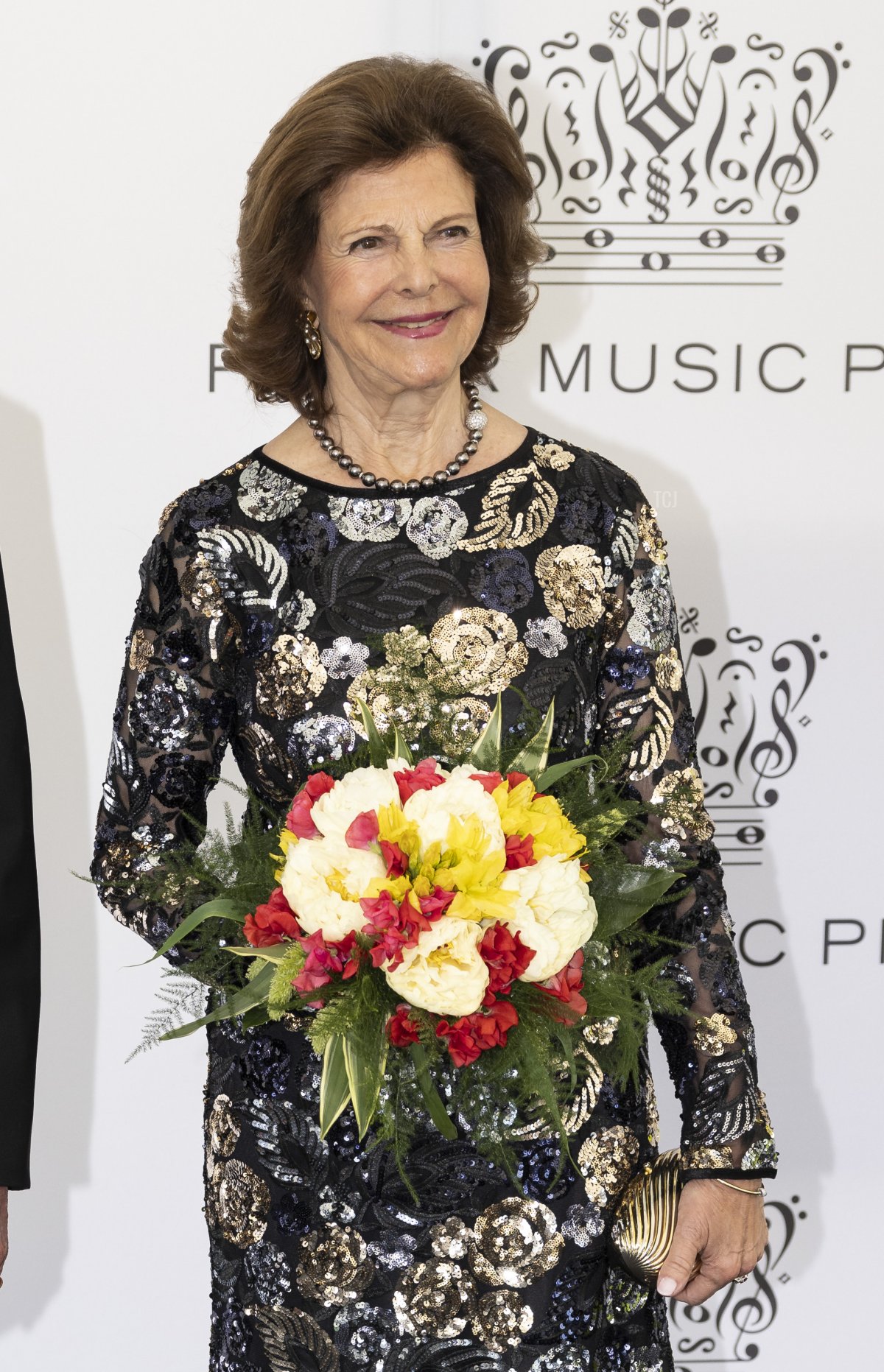 King Carl XVI Gustaf and Queen Silvia led the royal party in attendance at this year’s award. Queen Silvia wore a lovely column gown decorated in a floral pattern with sequins in shades of silver, black, and gold.