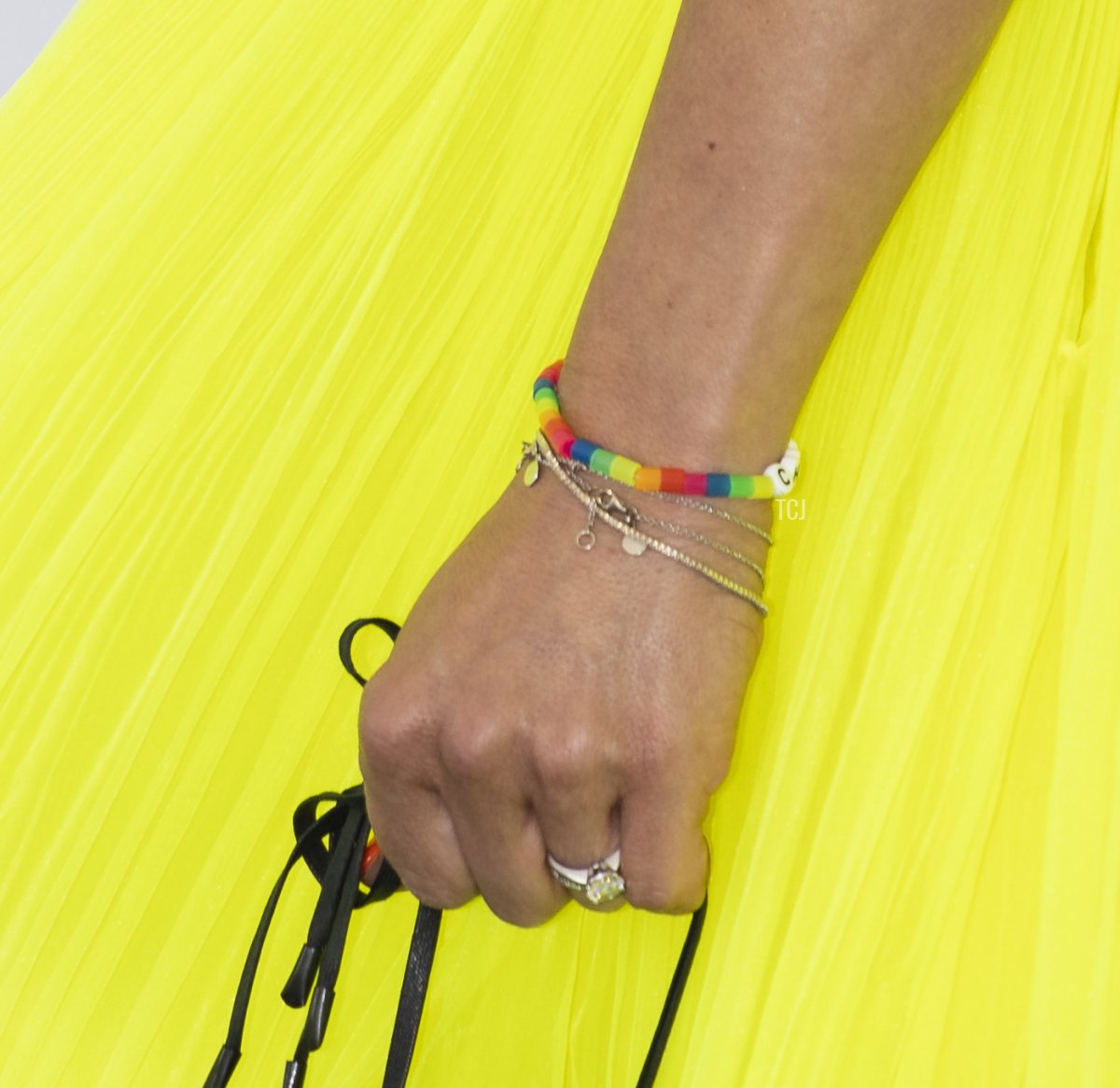 She carried the color theme through to her jewels as well. She wore an interesting pair of gold earrings with diamond accents (which I believe are leaf-shaped, though it’s tough to be sure) and a gold bangle with a pavé-set diamond detail. Her black pearl necklace also features a pavé-set diamond bead clasp.