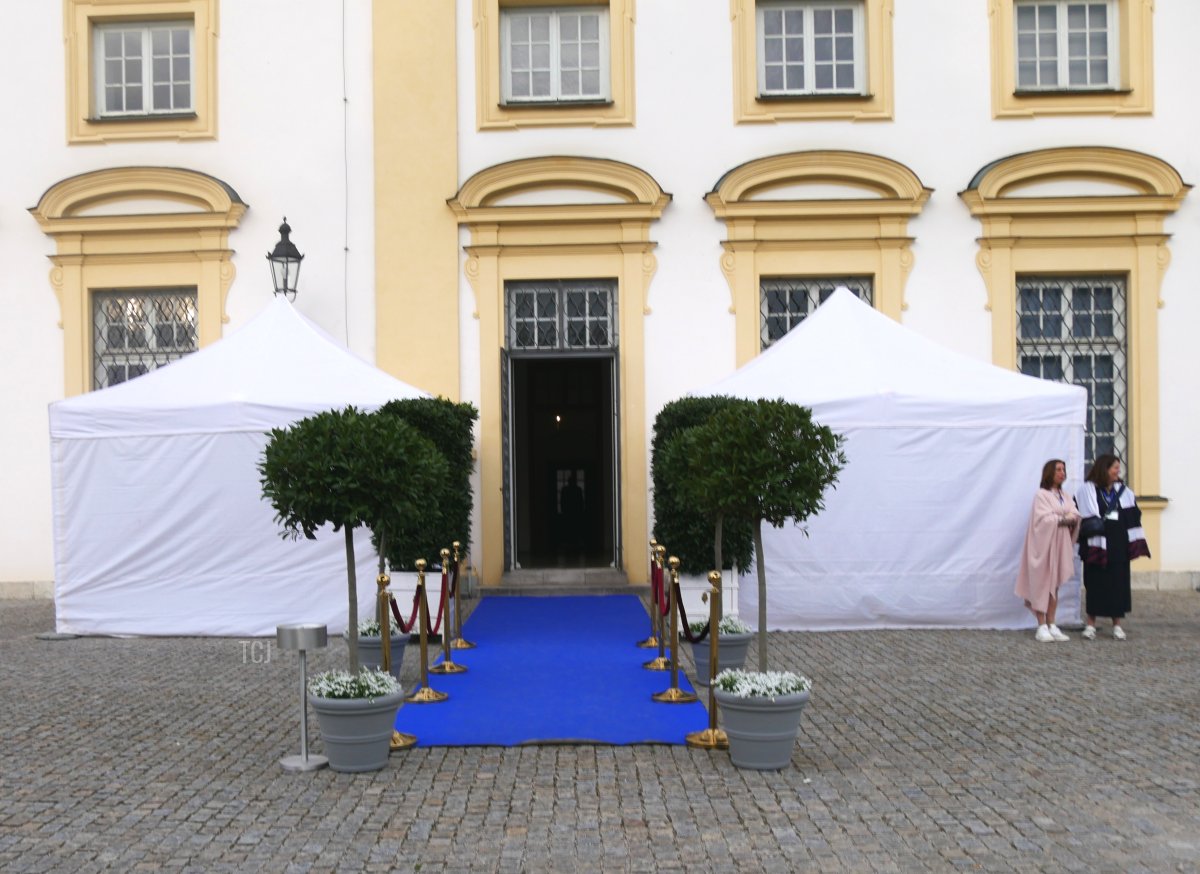 After the wedding, the celebrations continued at Schloss Nymphenburg, a baroque palace that was once the primary summer residence of the Bavarian royal family. Today, the head of the family, Prince Franz, Duke of Bavaria, still maintains a home at the palace. He hosted the reception for Prince Ludwig and Princess Sophie there on Saturday. (Sophie changed into a second dress for the gala, a light blue off-the-shoulder evening gown also made by WONA Concept. The color was specifically chosen so that the dress would be easier to rewear for later formal occasions.)