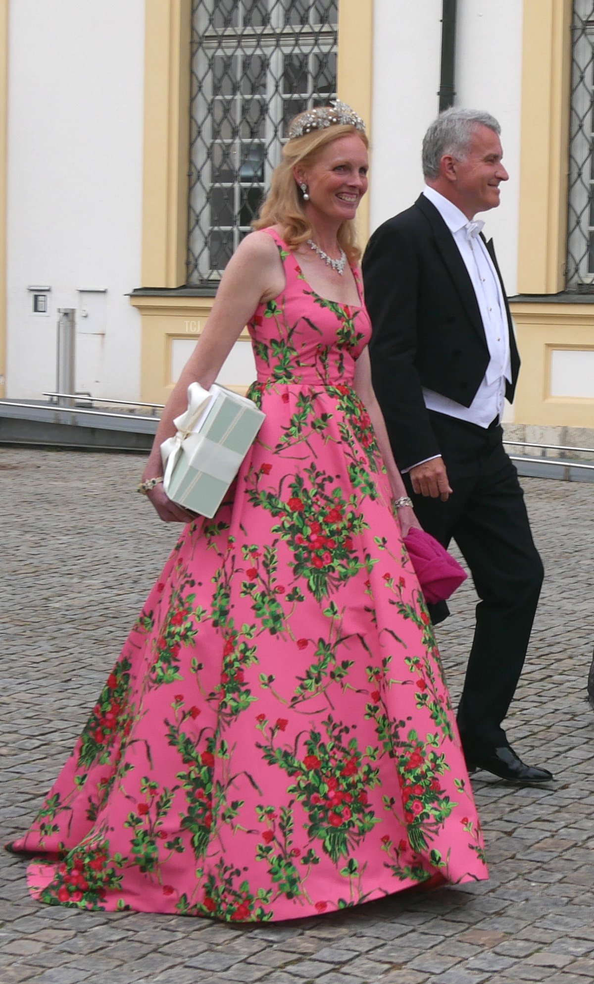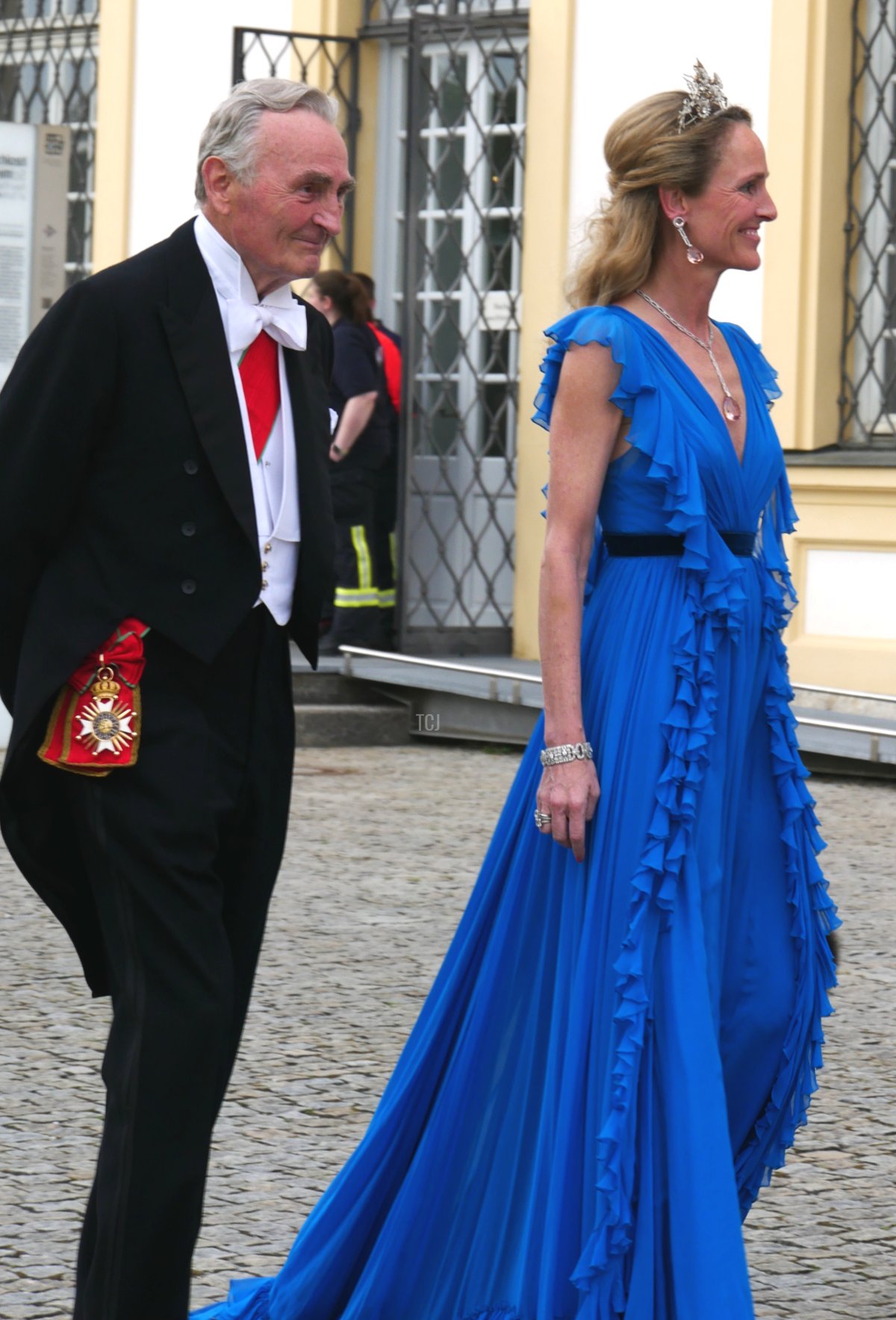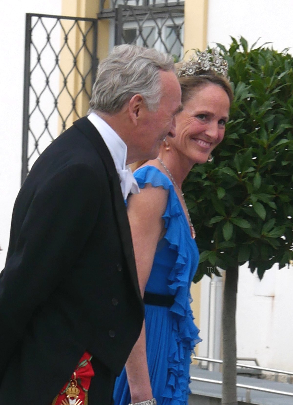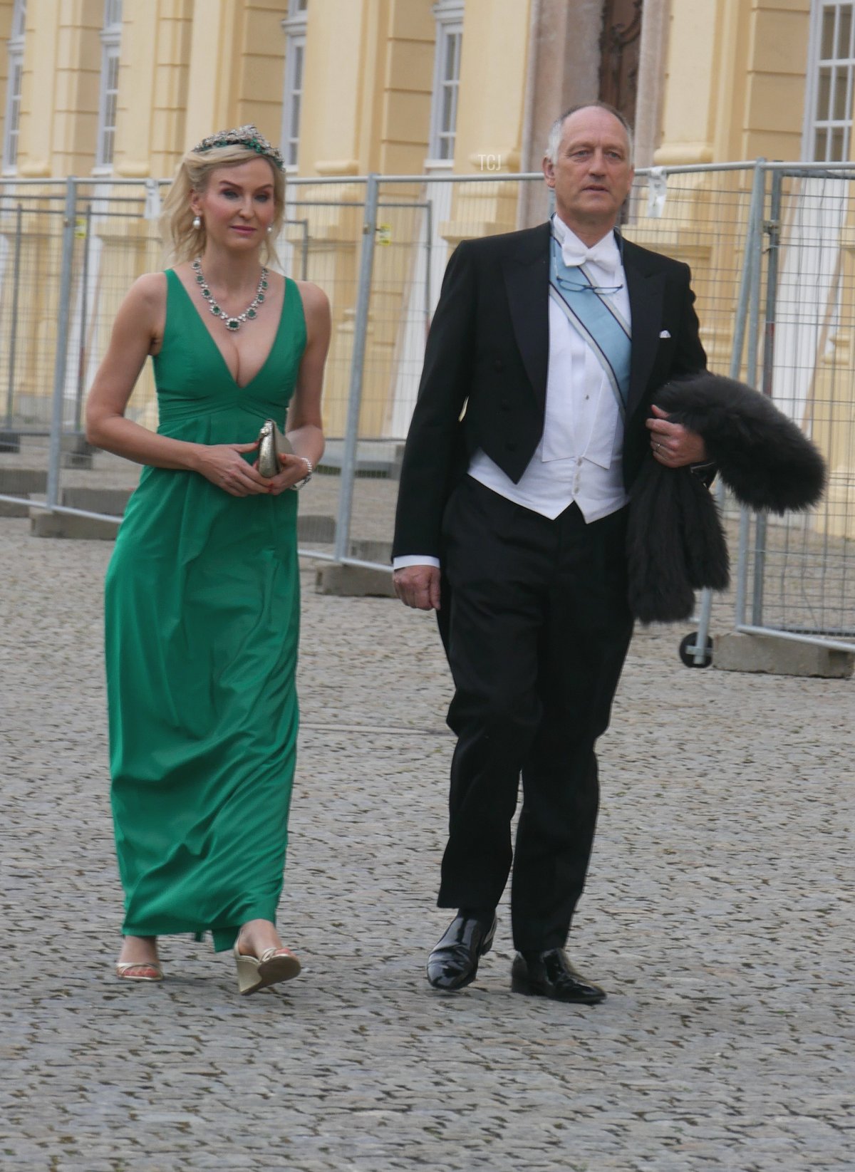And here are more cousins: Prince Wolfgang of Bavaria, a first cousin of the groom’s father, who arrived with his wife, Princess Tatiana. She wore sparkling diamonds, emeralds, and pearls for the occasion.