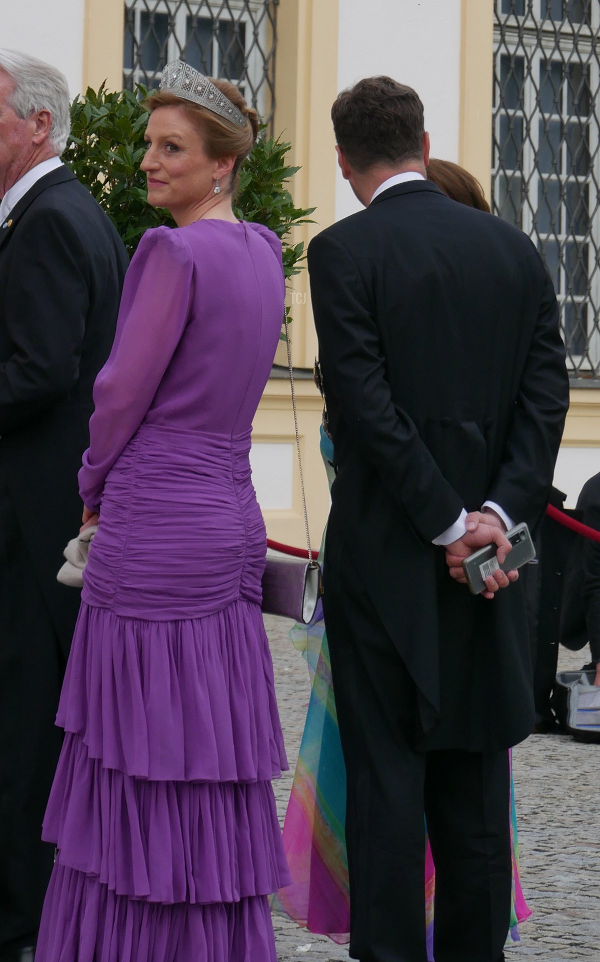The Bavarian royal family has a big, sprawling family tree, and there were representatives there from lots of different branches. Here’s Princess Anna of Sayn-Wittgenstein-Berleburg, wife of Prince Manuel of Bavaria. (Prince Manuel is a descendant of King Ludwig I of Bavaria and a distant cousin of the groom.) She wore the same petite diamond fringe tiara that she wore for the wedding of Princess Madeleine of Sweden in 2013.