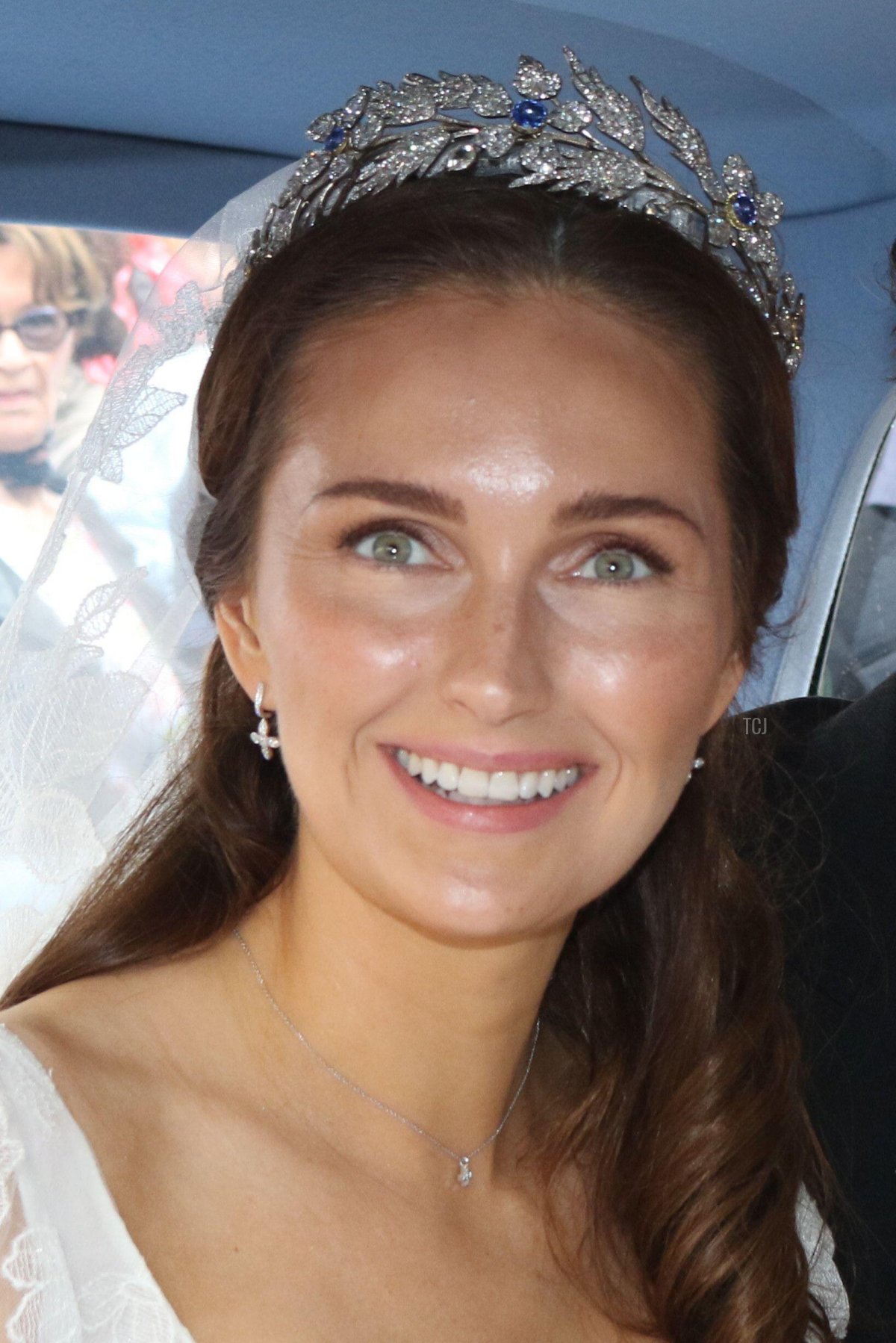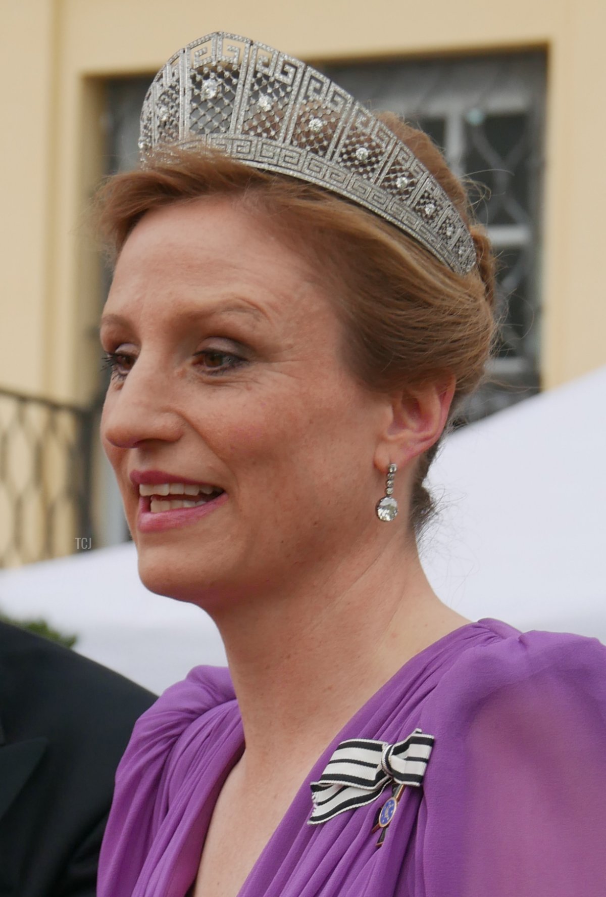 Princess Stephanie, wife of Prince Bernhard, Margrave of Baden, wore an heirloom tiara as well: the Baden Sunburst Tiara, which she also wore for her own wedding in 2001. This time, she wore it with diamond drop earrings and a gorgeous antique diamond necklace.