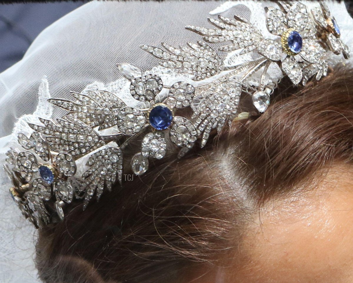 The floral theme carried through to her jewelry as well. She borrowed the family’s antique diamond and sapphire floral tiara. The jewel is a legacy from the groom’s grandparents, Prince Ludwig and Princess Irmingard of Bavaria.