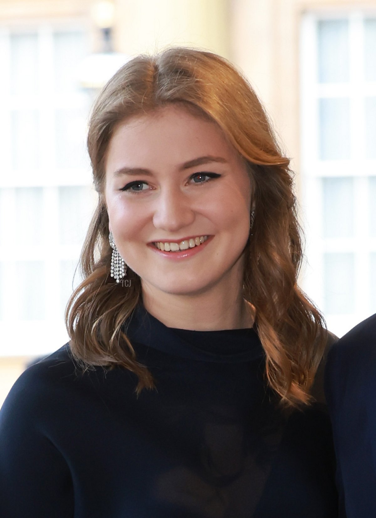 Princess Elisabeth borrowed a pair of her mother’s diamond fringe earrings for the reception. (Queen Mathilde is in London and will be attending tomorrow’s coronation.)