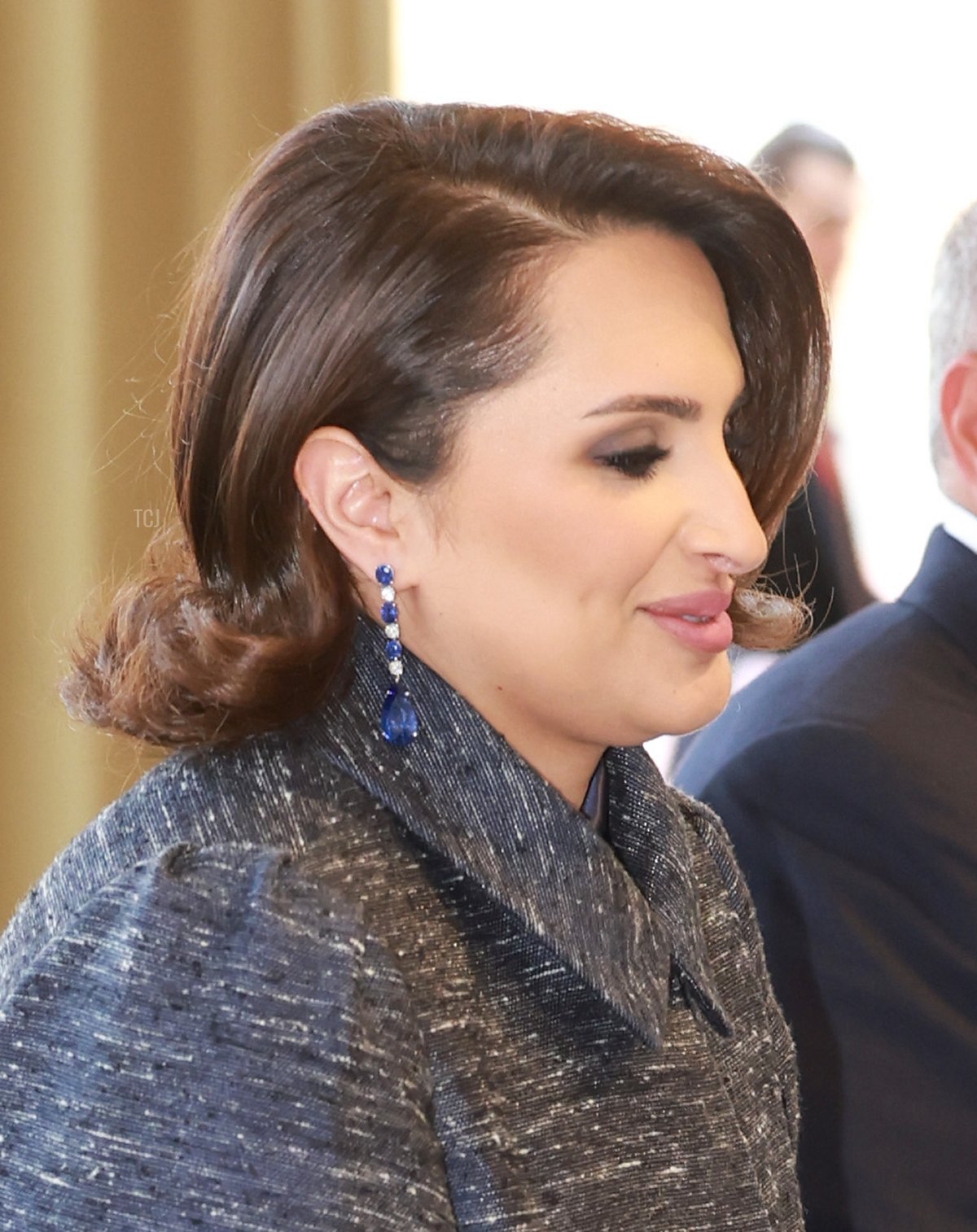 They’ve also got some astonishing jewels. Jawaher wore diamond and sapphire drop earrings, plus a large sapphire ring on her right hand, for this reception.