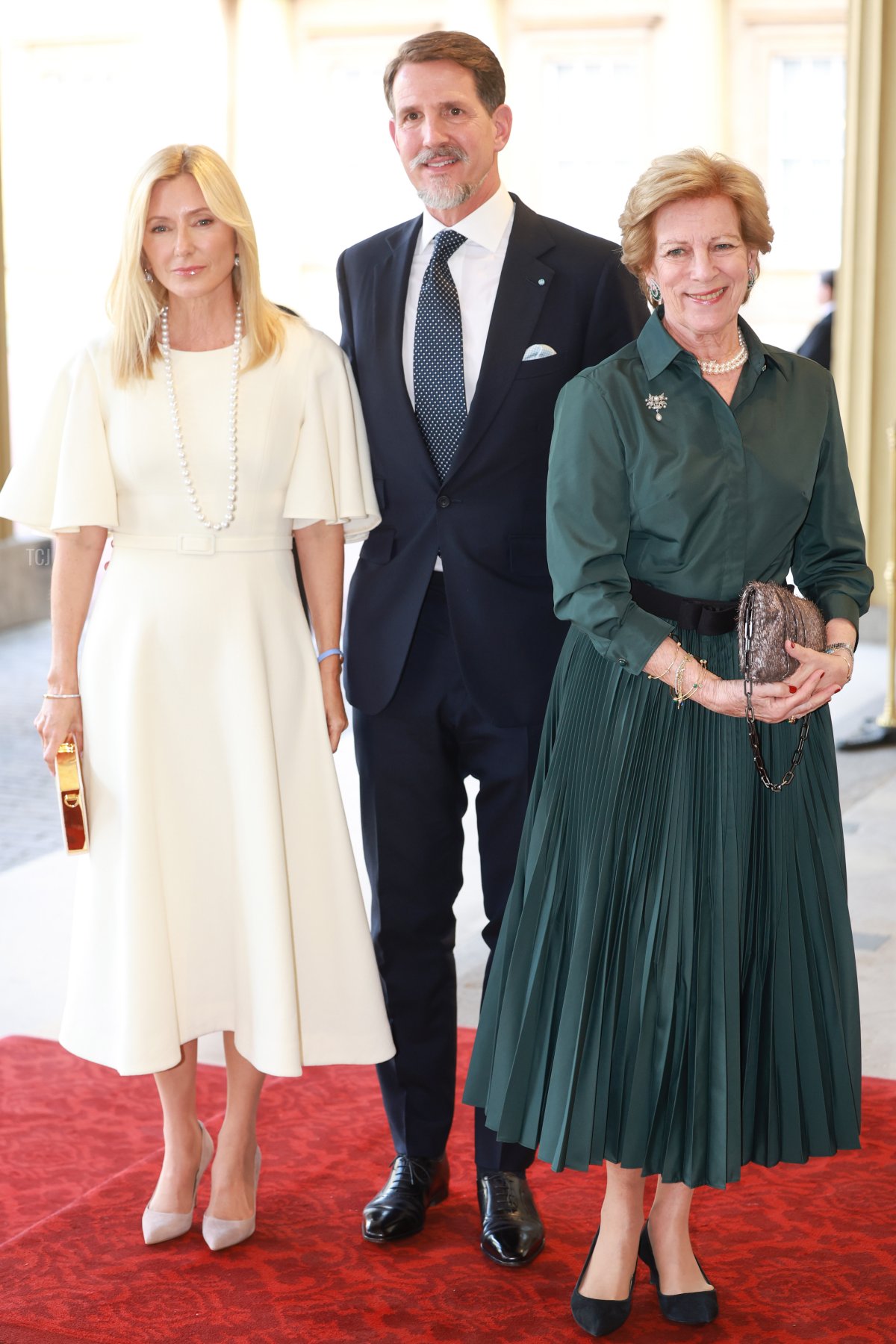 Three members of the former royal family of Greece (and current royal family of Denmark) were also in attendance: Queen Anne-Marie, Crown Prince Pavlos, and Crown Princess Marie-Chantal. The Greek royals are cousins of King Charles III through his father, the late Prince Philip. King Charles is also Crown Prince Pavlos’s godfather.