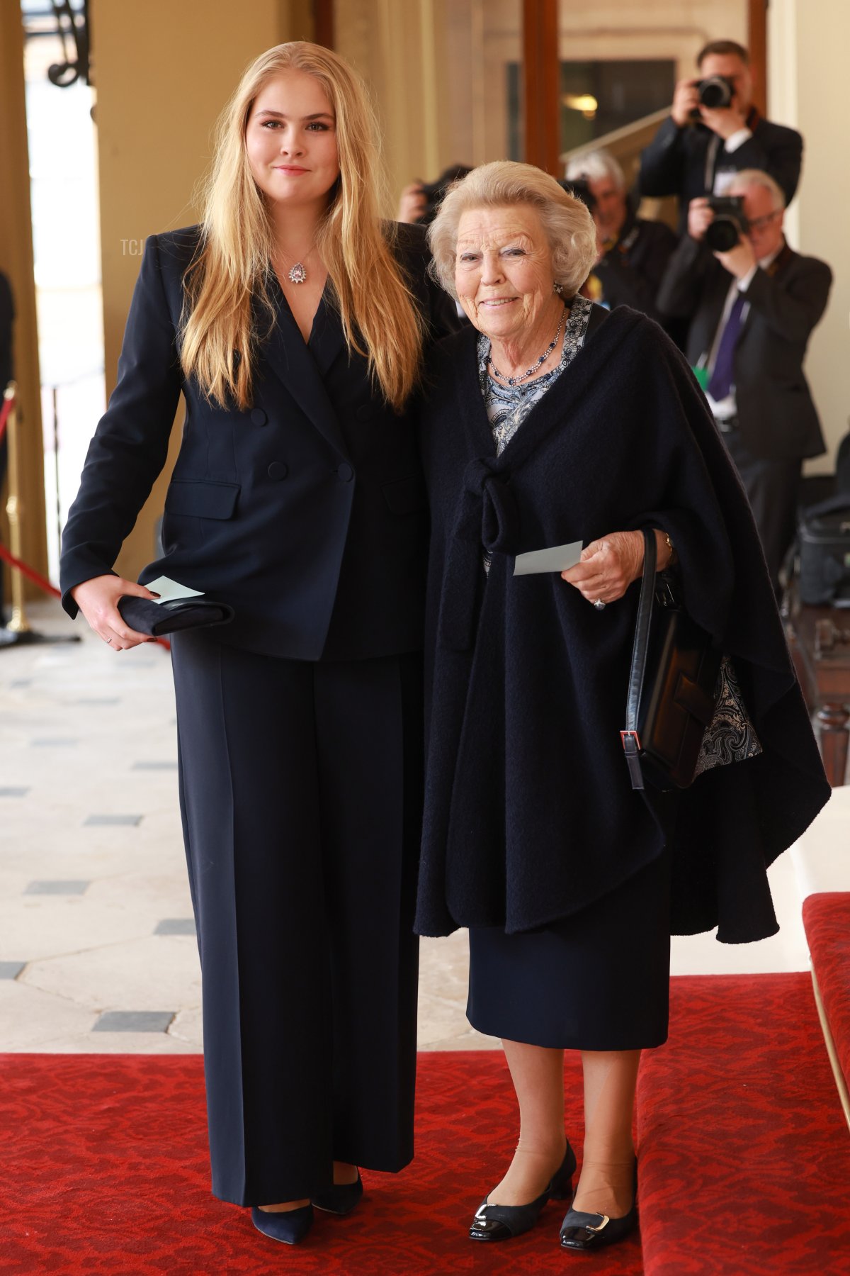 The King and Queen of the Netherlands will be attending tomorrow’s coronation, but tonight, the Dutch royal family was represented at the reception by Princess Beatrix and Princess Amalia. (Willem-Alexander and Máxima are currently attending the annual Liberation Day celebrations back home.) I thought Princess Beatrix looked really pleased and proud to be introducing her granddaughter to her royal family members and friends!