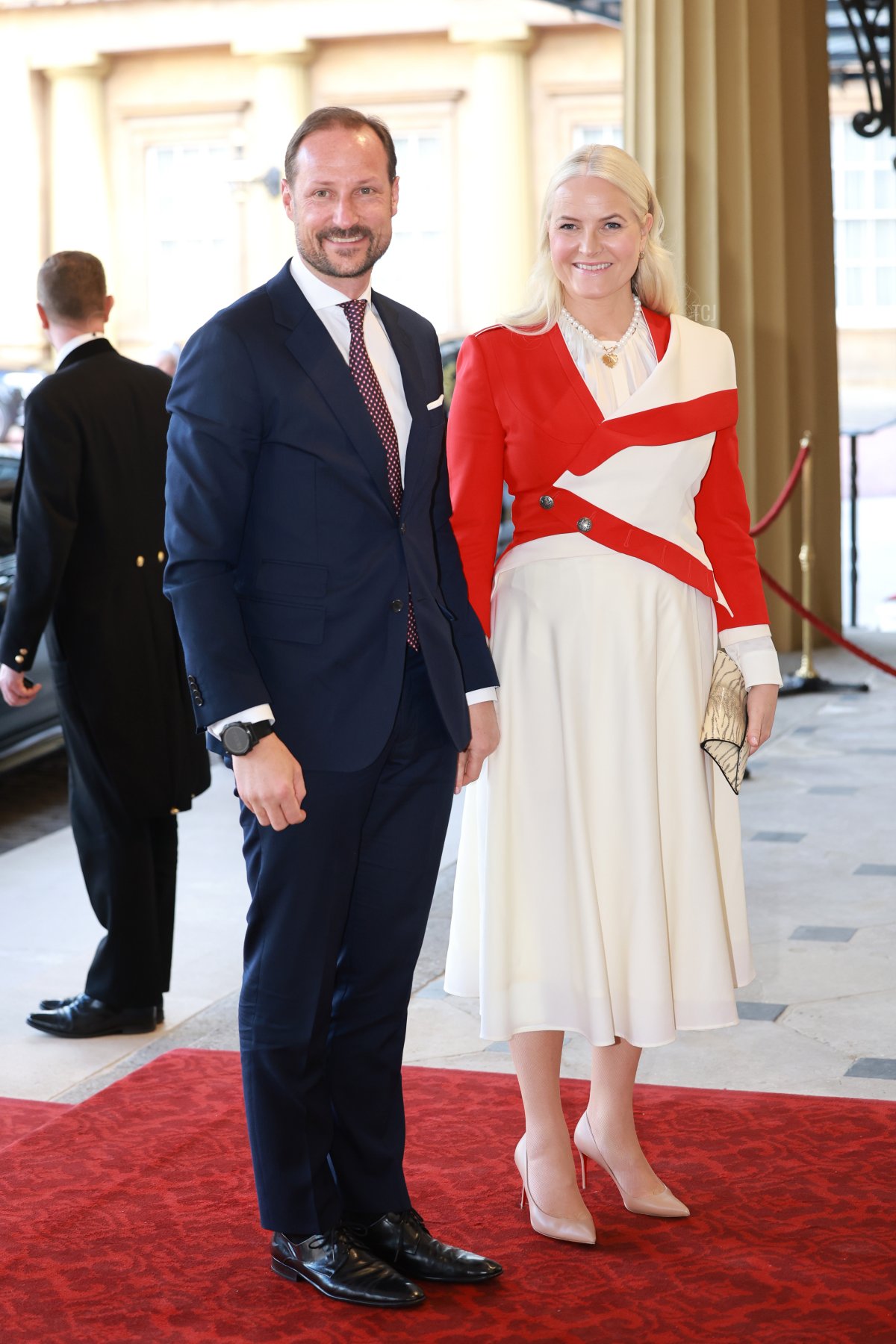 Crown Prince Haakon and Crown Princess Mette-Marit were on hand to represent the royal family of Norway. She wore an outfit in shades of red and white, two of Norway’s national colors. (Haakon added the third, blue, with his suit.)