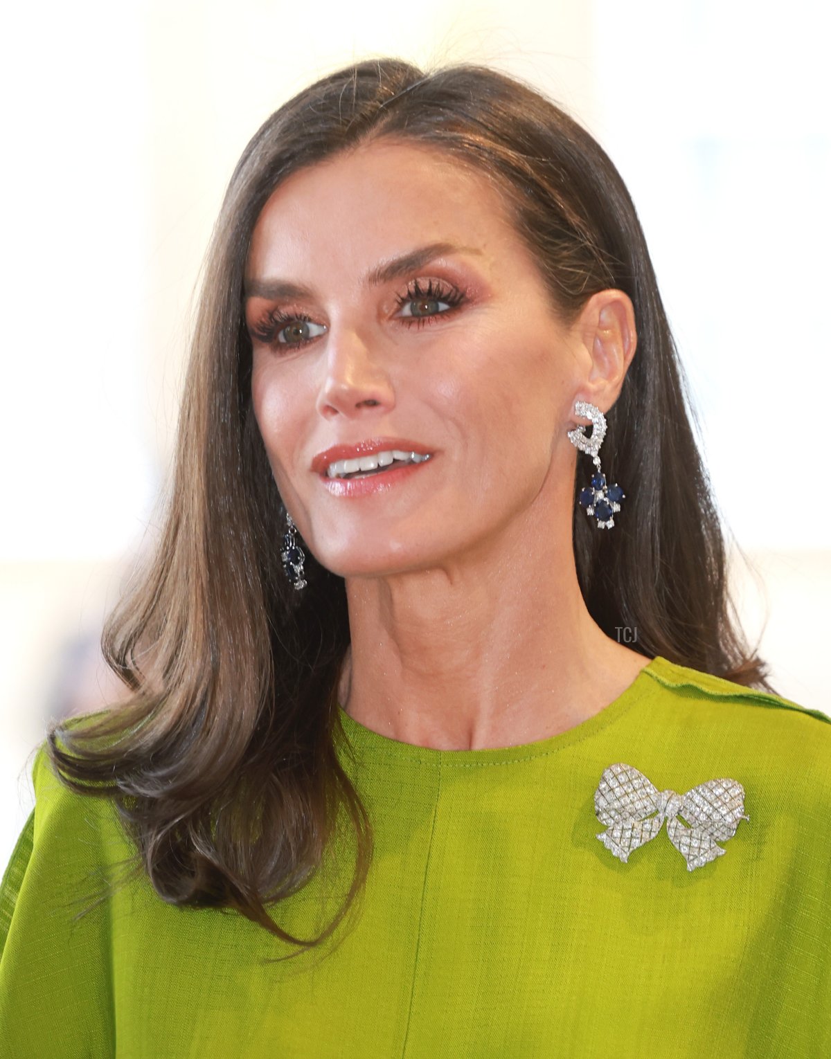 Letizia wore major diamond and sapphire earrings and a diamond and sapphire bracelet, plus a diamond bow brooch previously worn by her mother-in-law, Queen Sofia.