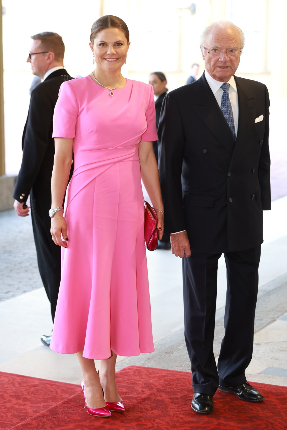 King Carl XVI Gustaf of Sweden arrived with his daughter and heir, Crown Princess Victoria, for the reception. She wore a pink dress with pink shoes and a red handbag.