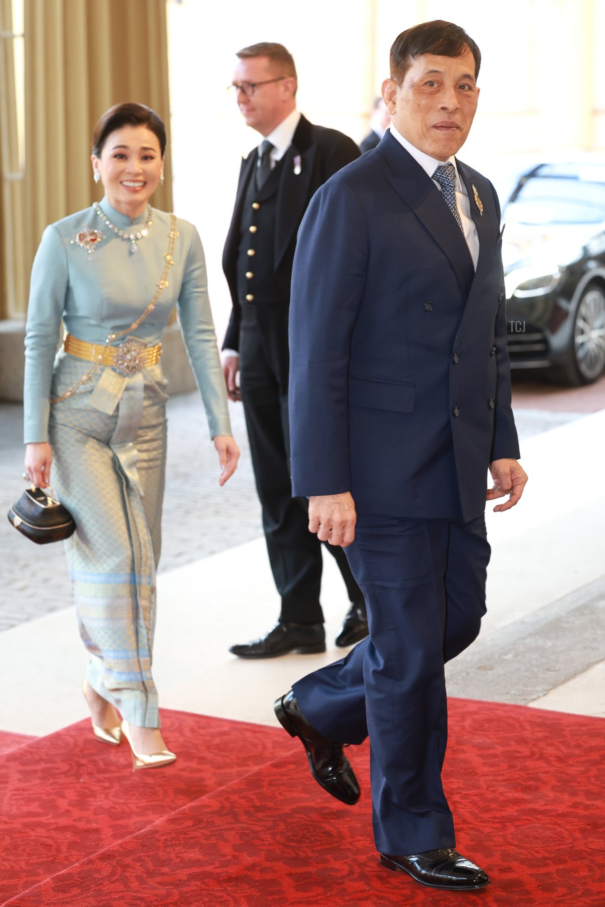 And finally, here are the King and Queen of Thailand arriving for the reception. Queen Suthida fairly dripped in diamonds for the occasion, including a really impressive diamond necklace.