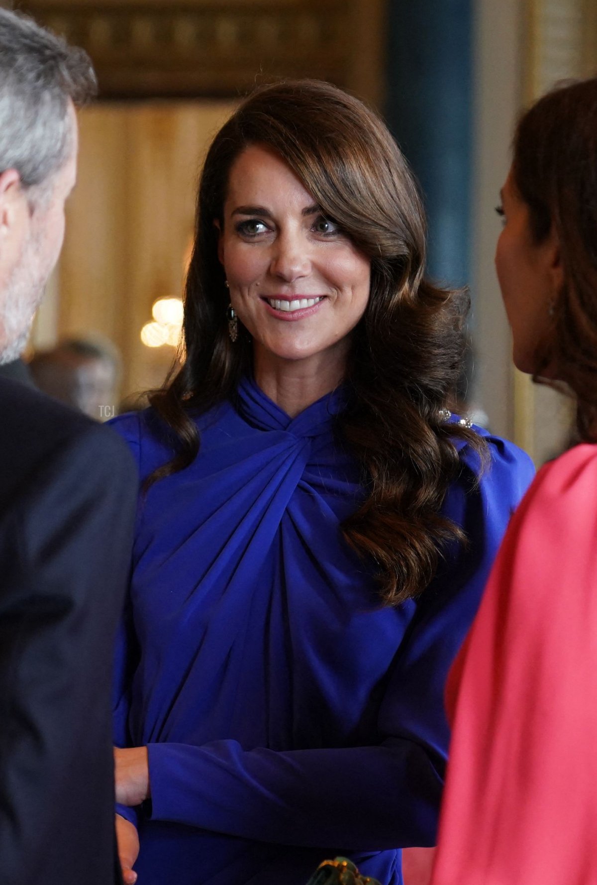 Princess Catherine wore a bright royal blue dress with crystal buttons on the shoulders and cuffs as she greeted guests, including a couple quite familiar to her, Crown Prince Frederik and Crown Princess Mary of Denmark.