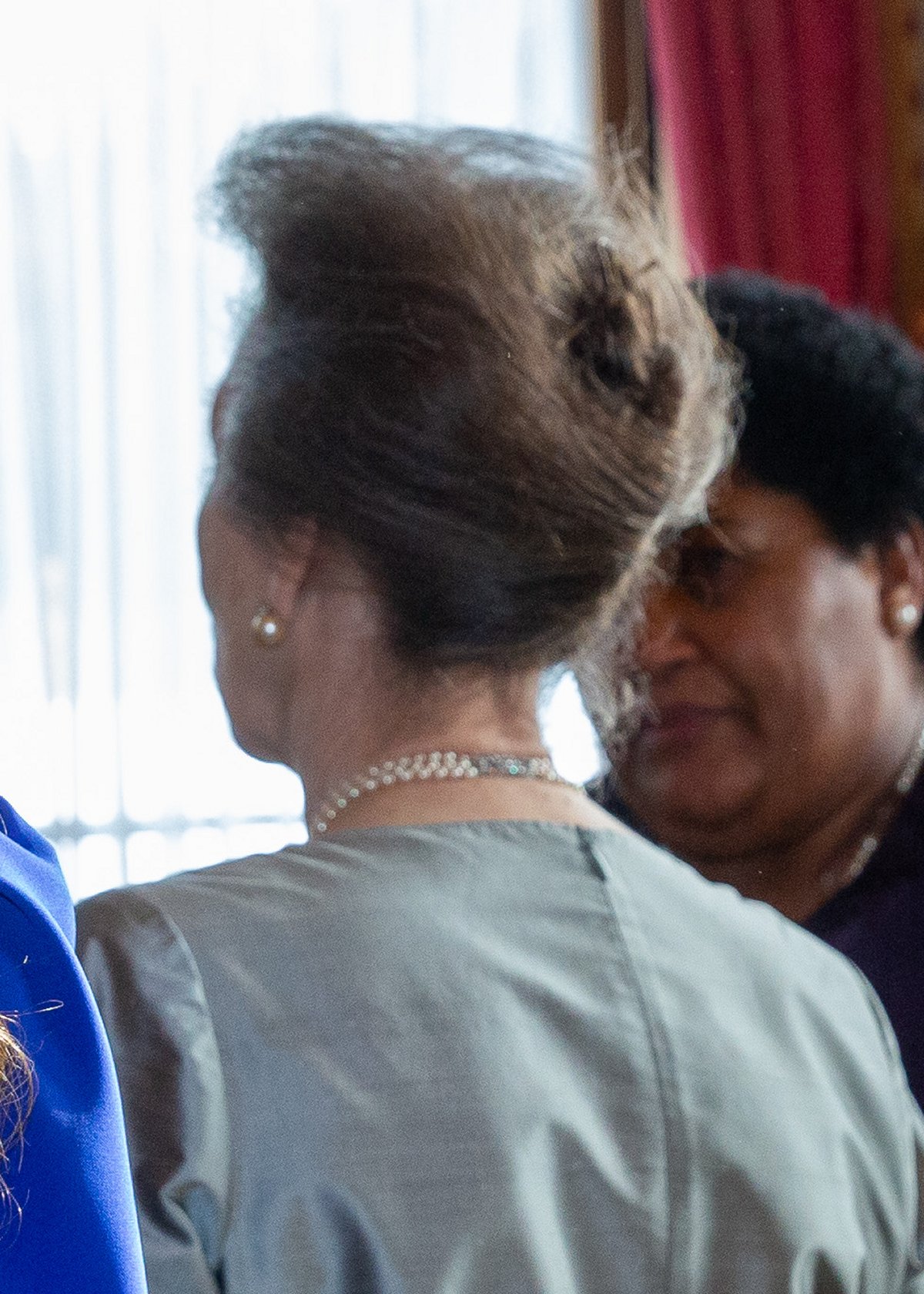 This is the best “blurry in the background” image that I was able to find of Princess Anne during the reception. It shows that the clasp of the necklace is horizontal and set with diamonds, just like the clasp of the 1952 pearl necklace. A clearer image would be needed to fully confirm that it’s the same necklace, but if you ask me, it’s looking more and more likely.