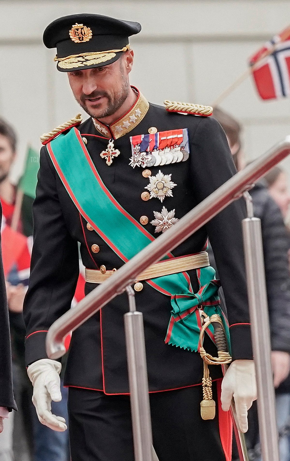 Crown Prince Haakon was dapper in uniform as he and the president reviewed an honor guard outside the Royal Palace in Oslo. The distinctive green and red sash that he wears here is part of the insignia of the Order of Merit of the Italian Republic.