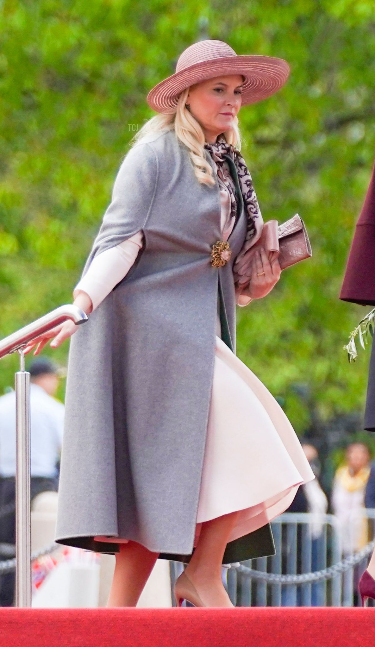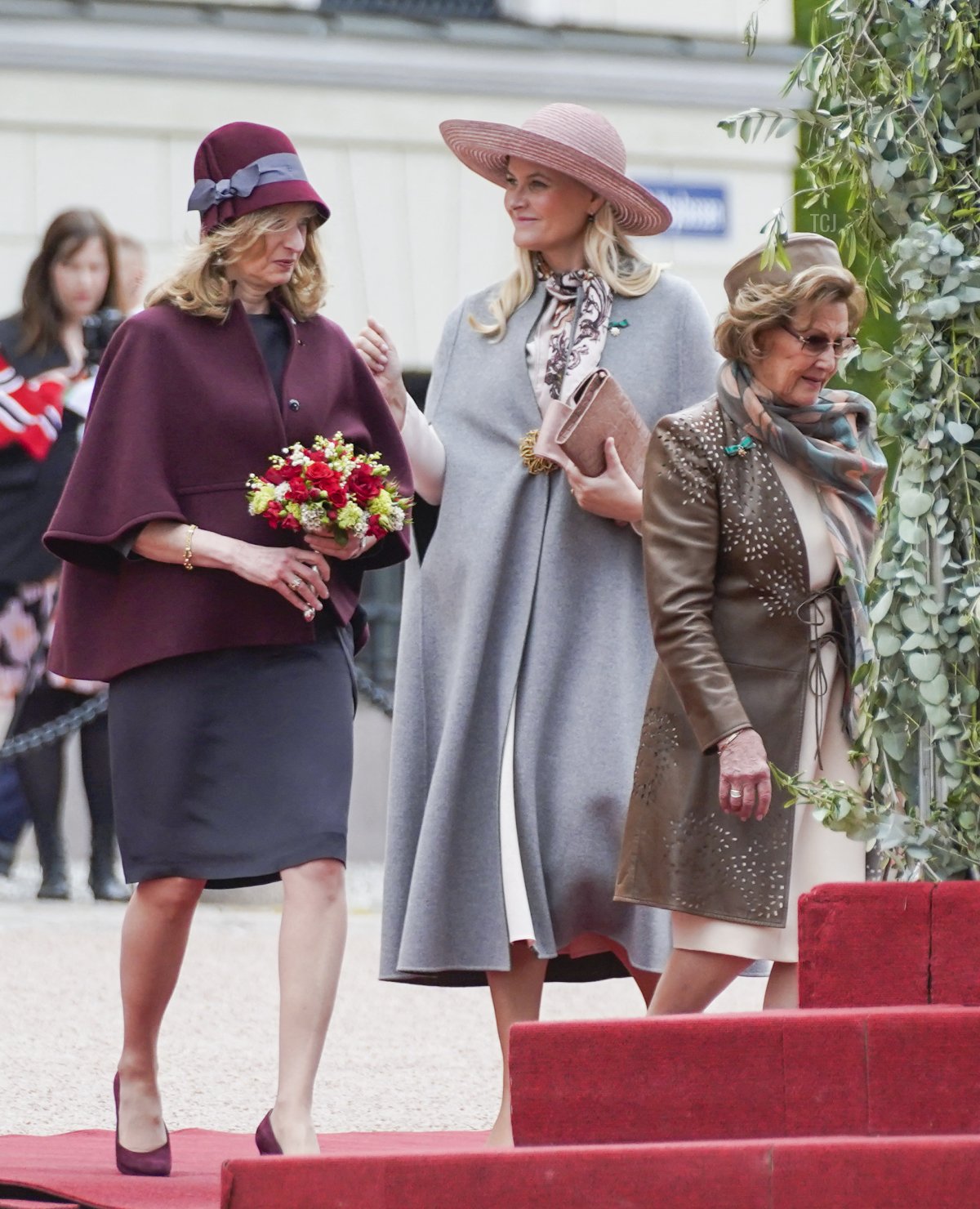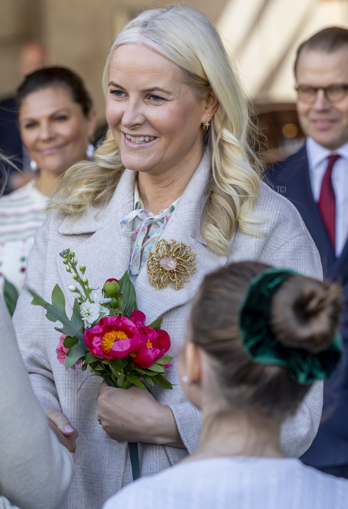 Crown Princess Mette-Marit’s most notable accessory was the modern gold and pink floral brooch that she used as a coat clasp.