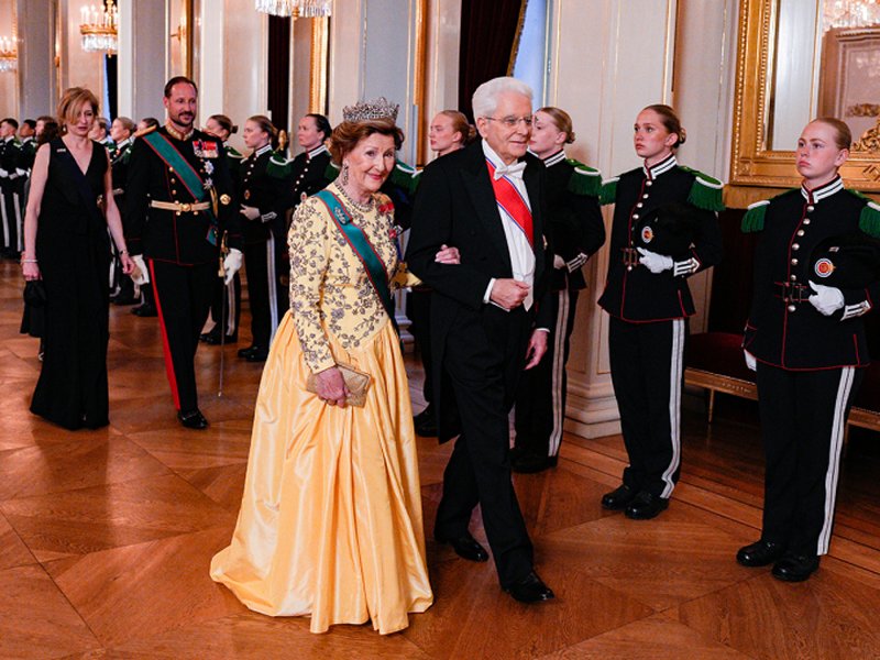 On Thursday evening, Crown Prince Haakon and Queen Sonja hosted a banquet in honor of President Mattarella at the palace. Queen Sonja wore a yellow evening gown from her archive, accessorized with major diamonds. For the banquet, she chose Queen Josefina’s Diamond Tiara, a nineteenth-century jewel that belonged to Joséphine of Leuchtenberg. Sonja also wore the diamond pendant earrings that belonged to Queen Alexandra of the United Kingdom, who was the mother of Queen Maud of Norway.