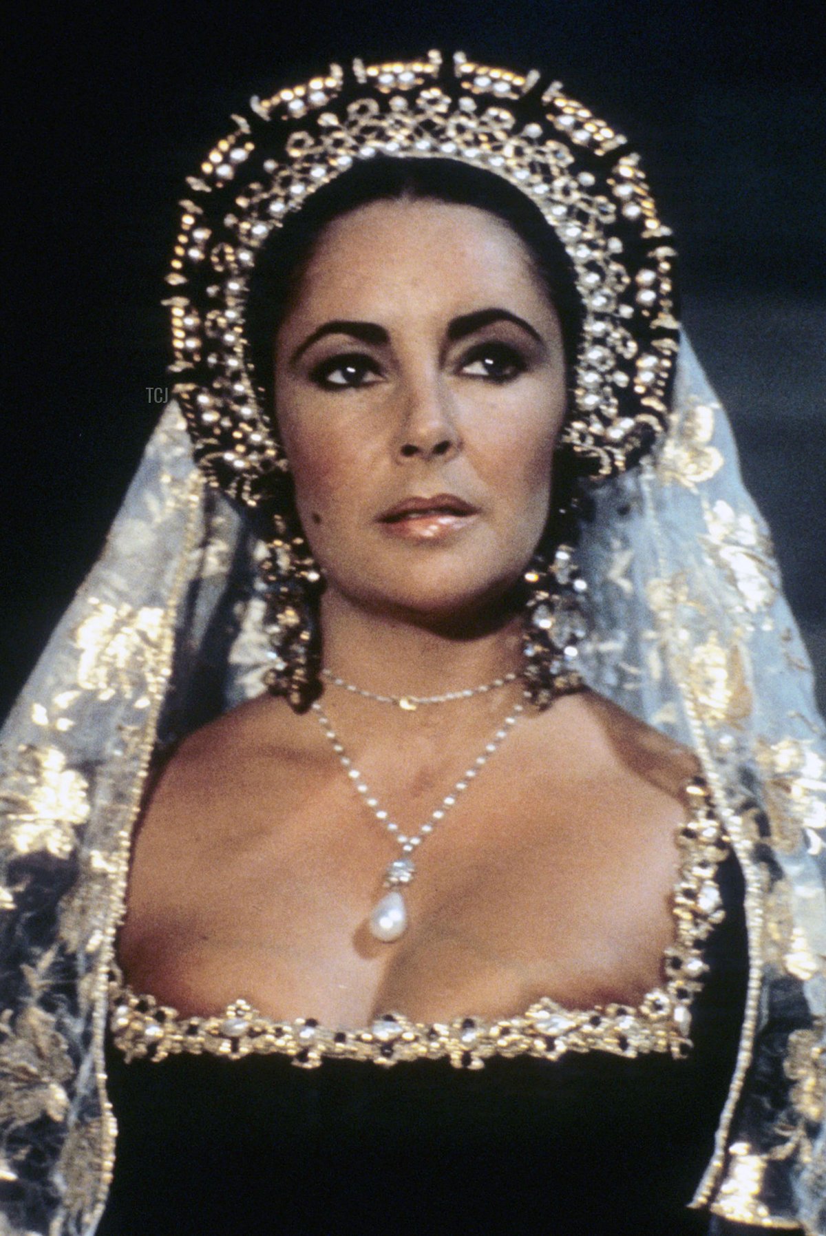 Taylor loved wearing her jewelry in public, even donning pieces from her collection in character on film sets. She wore La Peregrina with a Tudor costume for a cameo appearance in Burton’s film Anne of the Thousand Days in the summer of 1969. On October 22, 1969, Taylor wore La Peregrina—plus the diamond tiara and diamond girandole earrings from Mike Todd, and the Krupp Diamond Ring and a diamond and pearl necklace also gifted by Burton—for the royal premiere of Burton’s film Staircase. On that occasion, she met with Princess Margaret, bringing La Peregrina back within the vicinity of royalty once more.