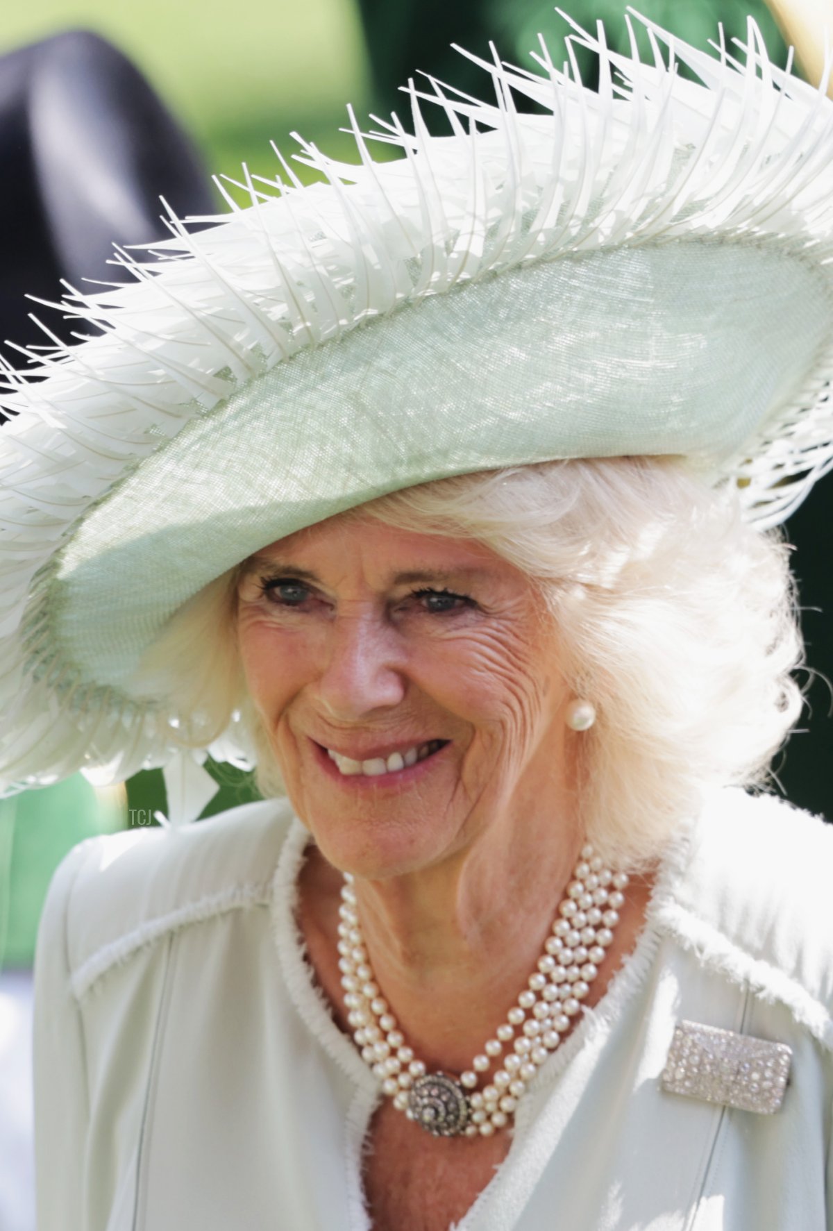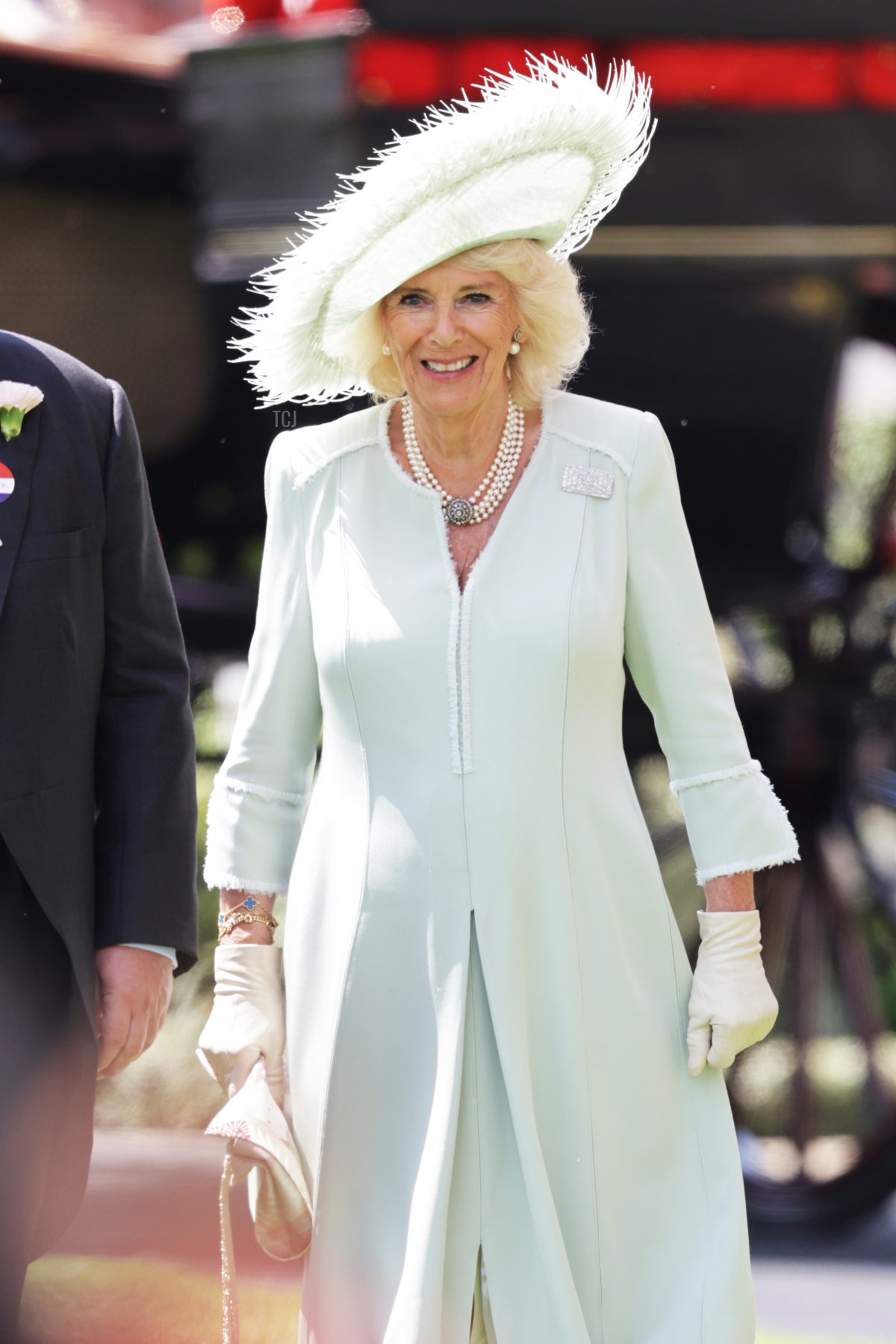 Queen Camilla again turned to two of her go-to fashion sources, the designer Anna Valentine and the milliner Philip Treacy, to create her mint green Ascot ensemble for Thursday.