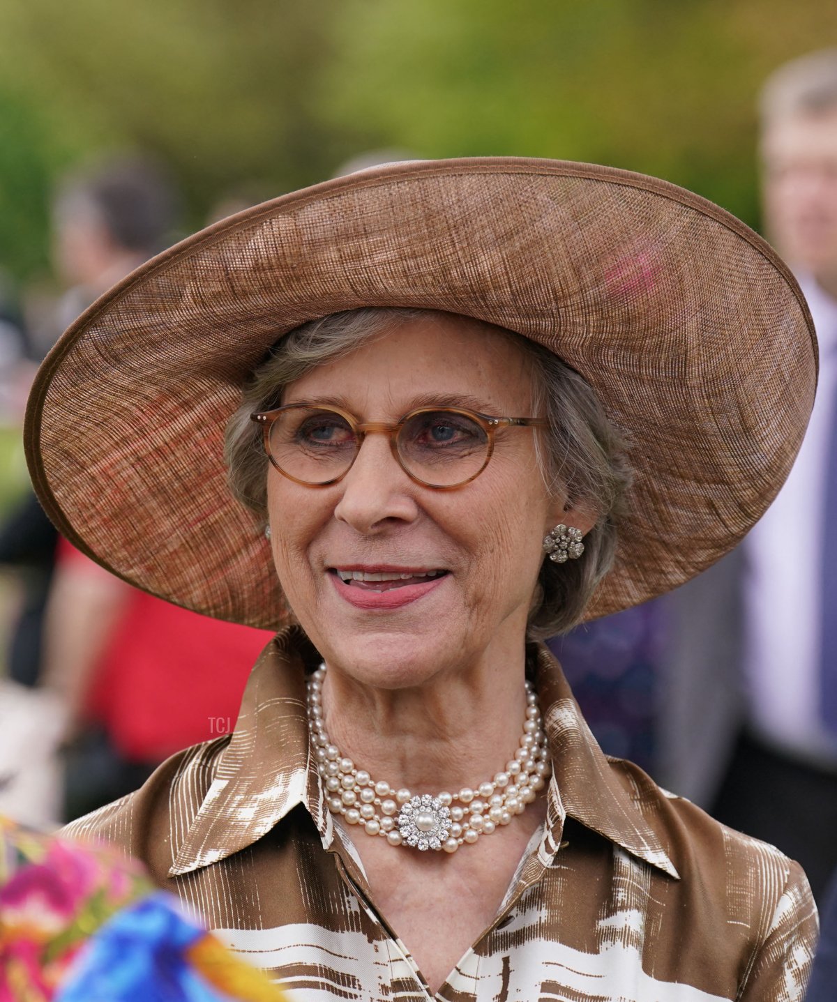 She wore the same outfit and hat, with different jewelry, for a garden party at the palace on May 9.