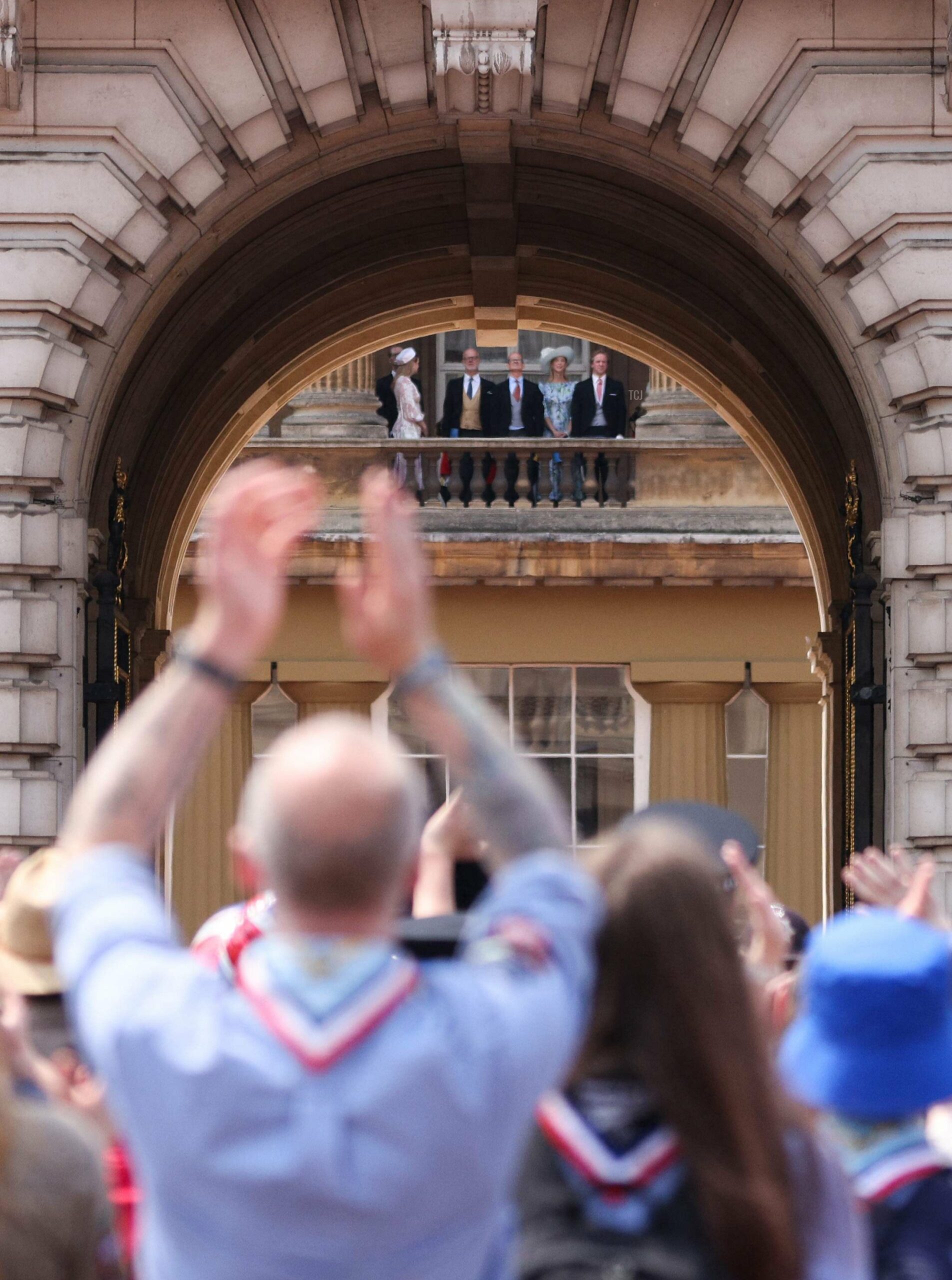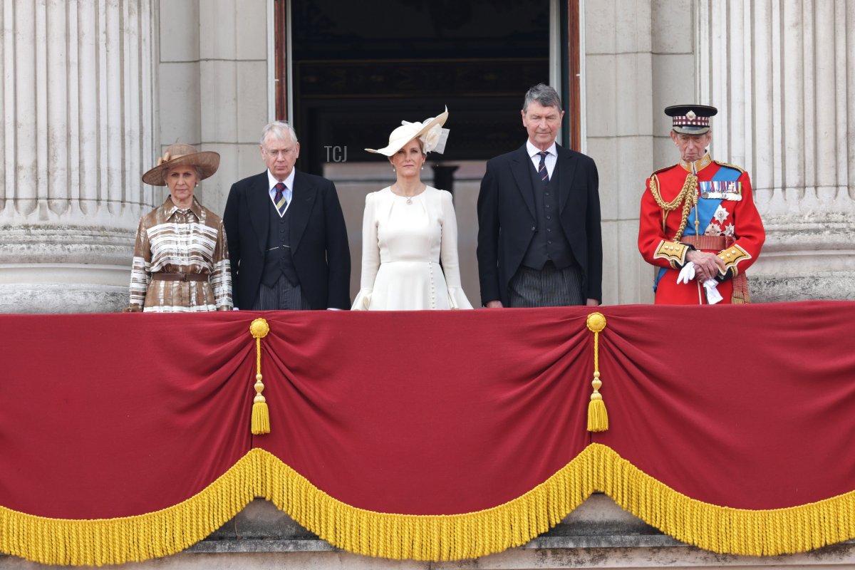As has become normal in recent months, only a small group of royals (the King and Queen, the Prince and Princess of Wales and their children, the Princess Royal and Sir Timothy Laurence, the Duke and Duchess of Gloucester, and the Duke of Kent) were present on the main Buckingham Palace balcony for Trooping the Colour. But the extended royal family still attended the celebrations, and one canny photographer captured a glimpse of some of them watching the fly-past from an interior balcony inside the Buckingham Palace courtyard.