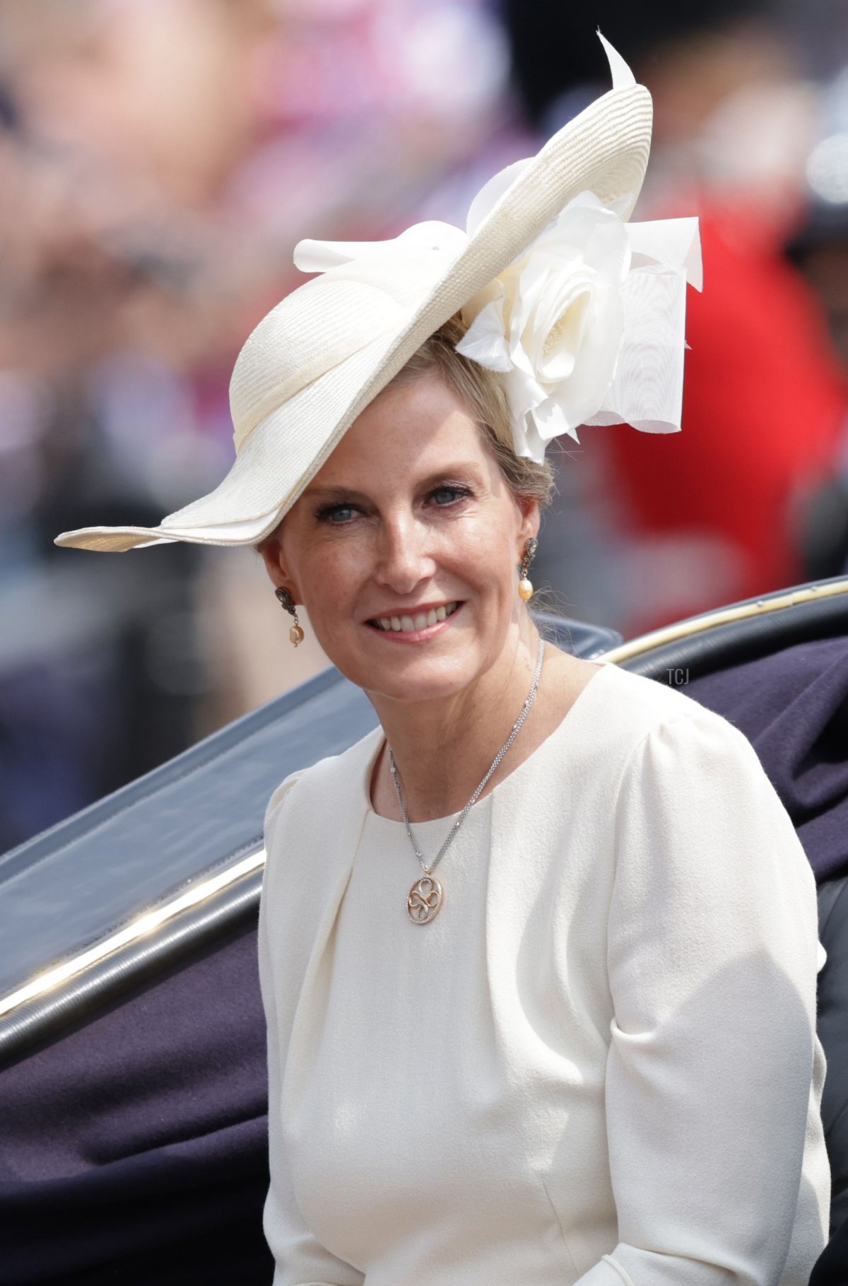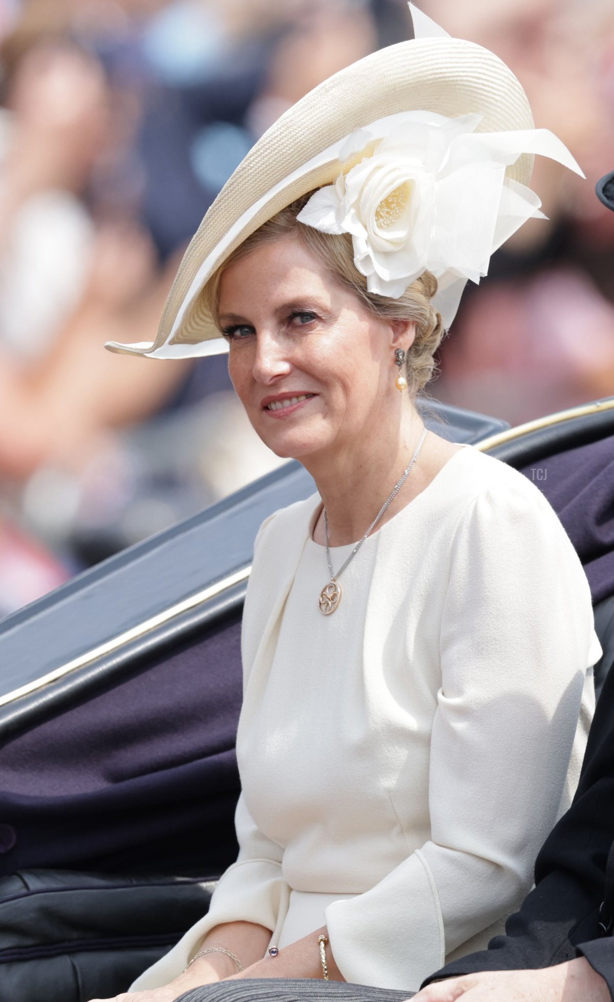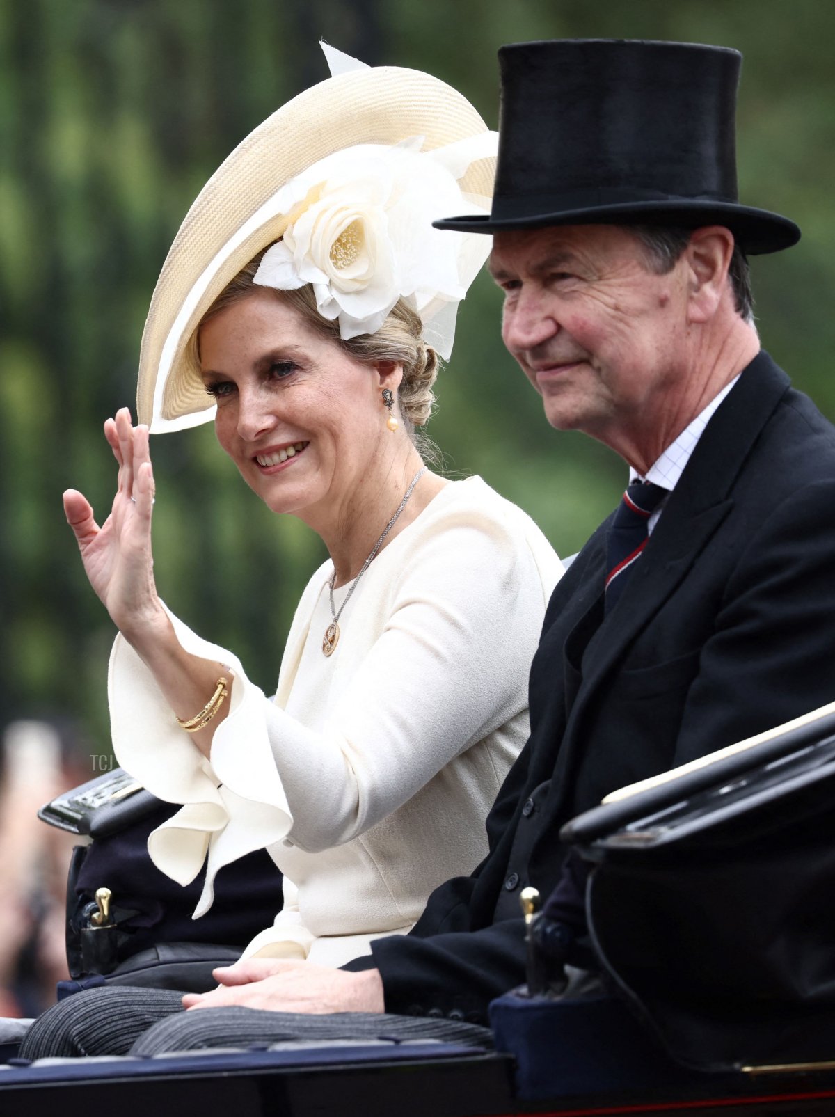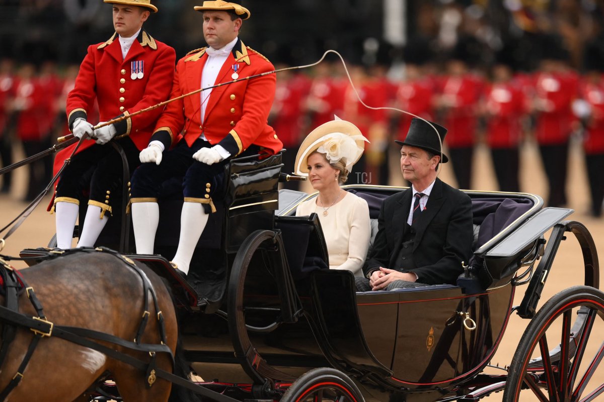 The Duchess of Edinburgh (who some of you are still probably calling “the Countess of Wessex” in your heads) rode in a carriage from Buckingham Palace to Horse Guards Parade this morning with her brother-in-law, Sir Timothy Laurence. Both of their spouses (the Duke of Edinburgh and the Princess Royal) rode on horseback during the parade.