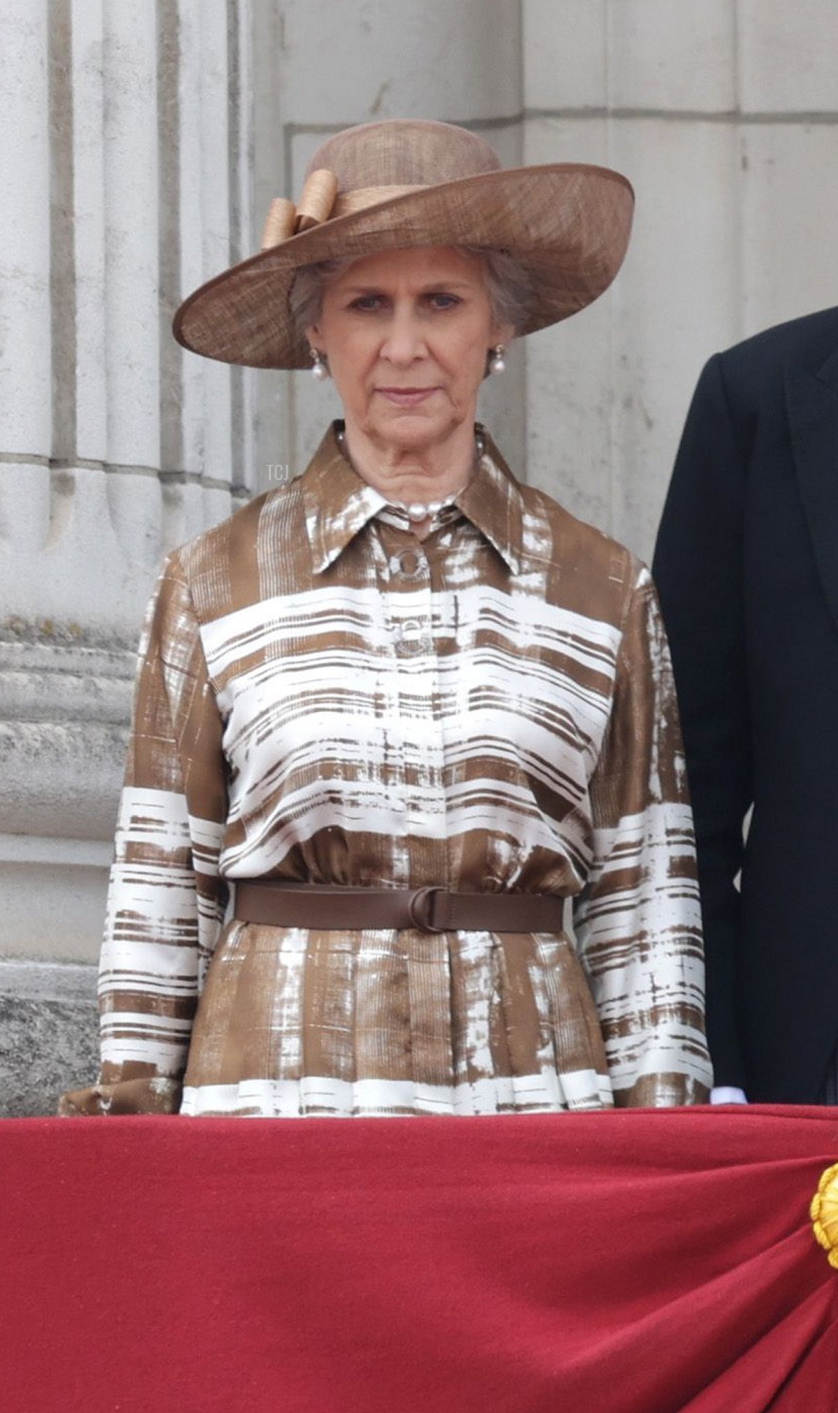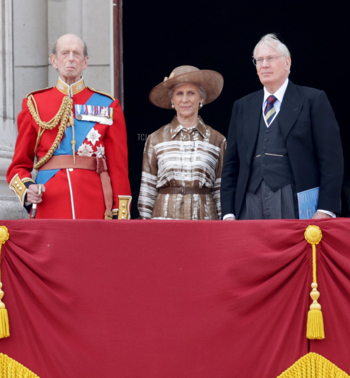 The Duke and Duchess of Gloucester also appeared on the balcony for the fly-past, joined by the Duke of Kent. Birgitte wore an ivory and brown printed dress with a coordinating hat for the occasion.