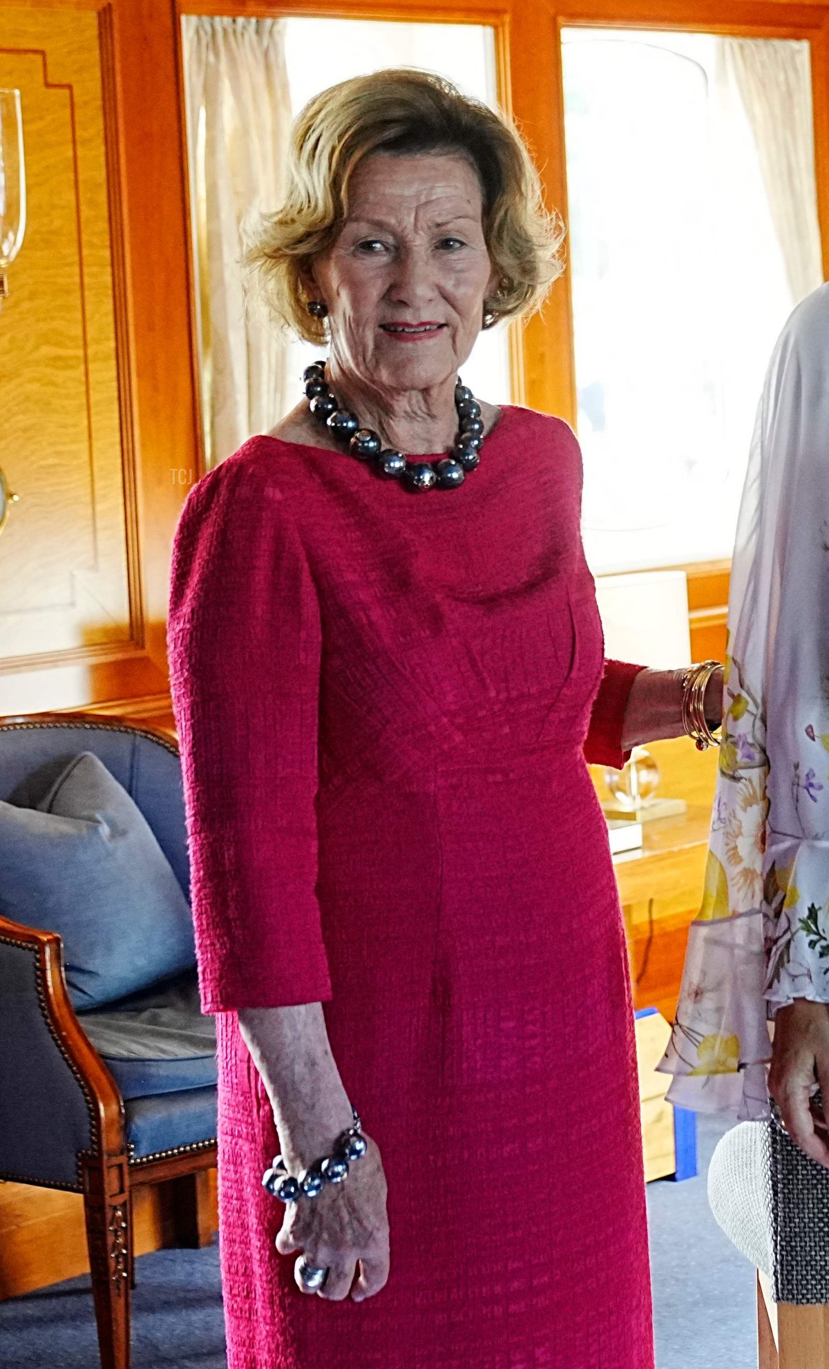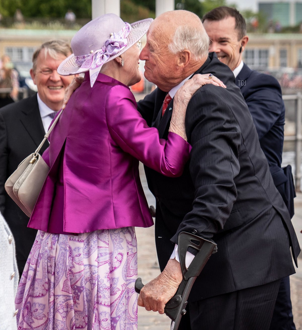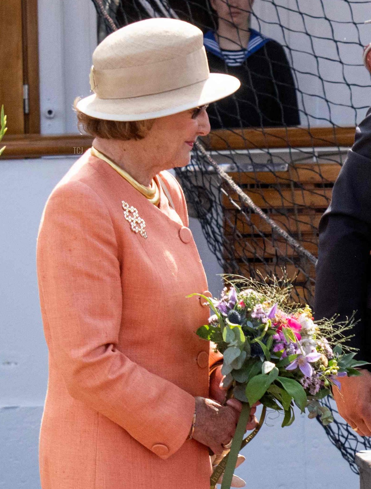 King Harald V and Queen Sonja of Norway sailed to Denmark aboard the royal yacht Norge, arriving in Copenhagen on Thursday. There, King Harald’s cousin, Queen Margrethe II of Denmark, was there to greet the royal couple. (They’re second cousins, both great-grandchildren of King Frederik VIII of Denmark.) Both 83-year-old Margrethe and 86-year-old Harald have been dealing with serious mobility issues in recent years, and Harald tripped a little when climbing the stairs to greet his fellow monarch. “I come in deep admiration for you!” he quipped as he was helped to his feet. “Don’t expect the same from me,” Margrethe laughed as the two hugged.