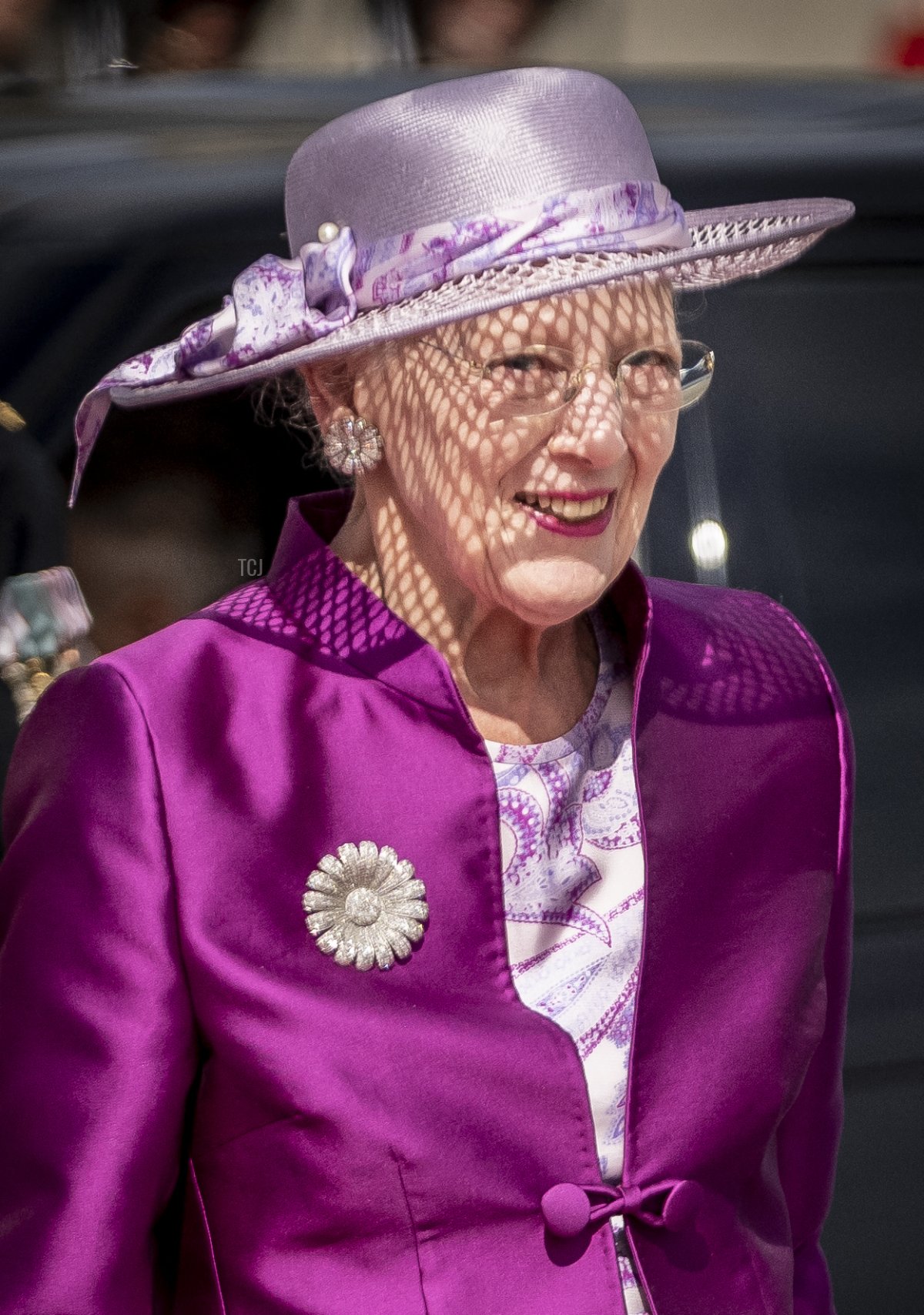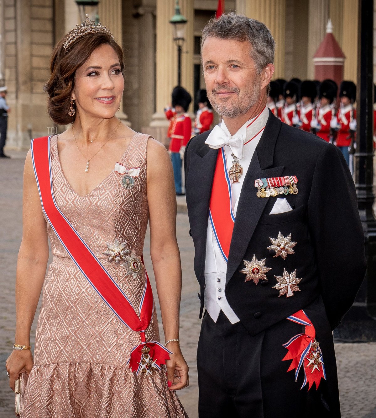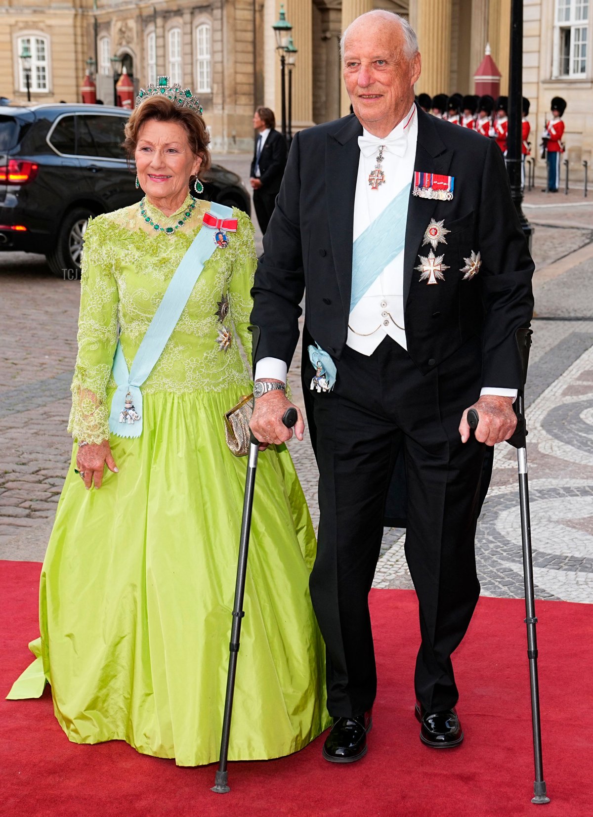 King Harald and Queen Sonja arrived at Amalienborg for the gala dinner wearing the insignia of Denmark’s highest chivalric order, the Order of the Elephant.