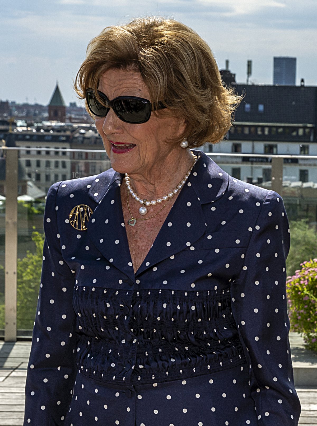 Queen Sonja chose a touching brooch for her arrival in Denmark, too. She wore the special commemorative brooch created by Georg Jensen in 2022 to mark Queen Margrethe’s Golden Jubilee, plus pearls and a necklace with a heart pendant.