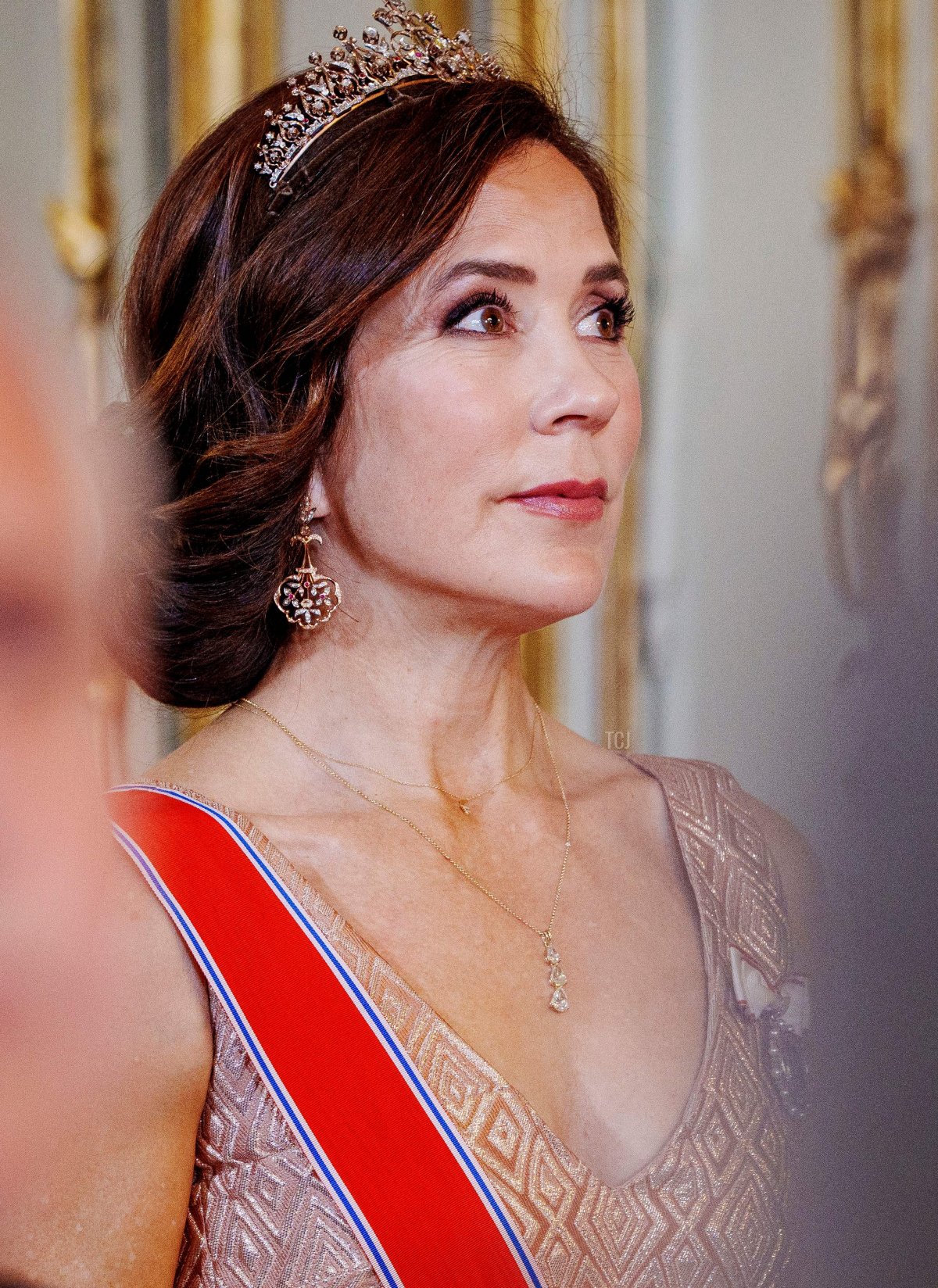 On both occasions, Mary wore her convertible diamond necklace tiara, which dates to the turn of the 20th century. The jewel was an auction purchase several years ago, and Mary later had new earrings created to match.