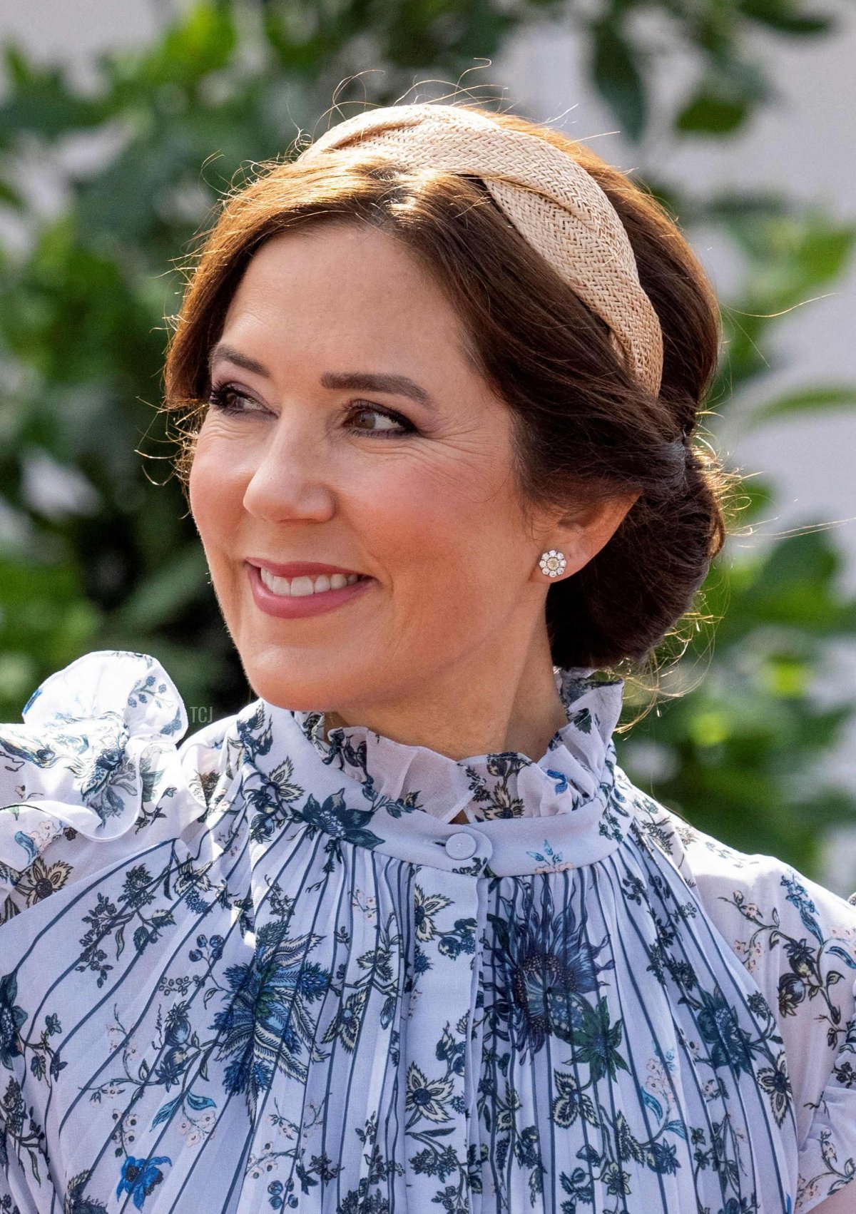 Crown Princess Mary wore a pair of diamond floral stud earrings with her blue flowered dress.
