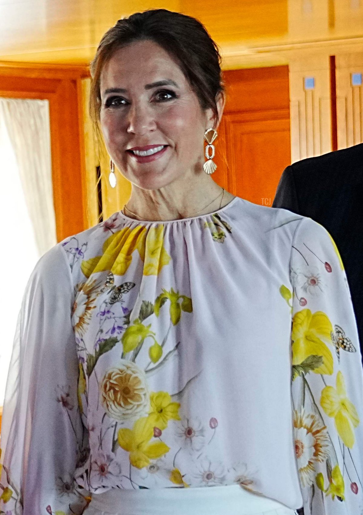 Crown Princess Mary accessorized with a pair of gold earrings with shell motifs. She wore the same pair of earrings last year for an official dinner during her visit to Oslo.