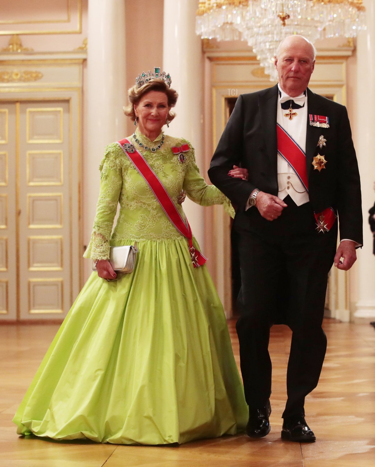 Queen Sonja wore an elaborate ballgown in a shocking shade of lime green for the dinner.