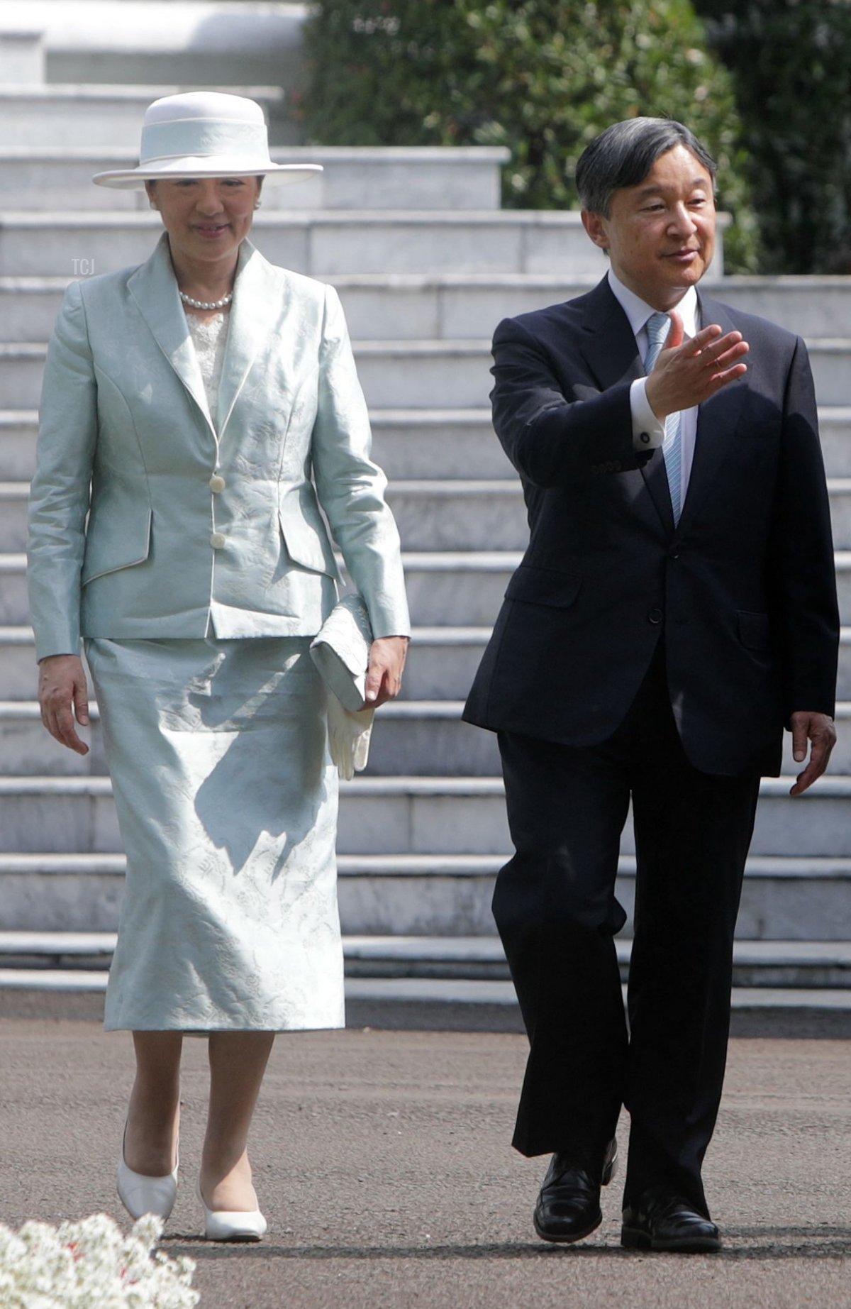She wore the same outfit, sans hat, for the couple’s return to Tokyo that evening. They were greeted at the airport by Crown Prince Fumihito and Crown Princess Kiko, who wore a light blue suit with pearl earrings, a single-stranded pearl necklace, and a small brooch.