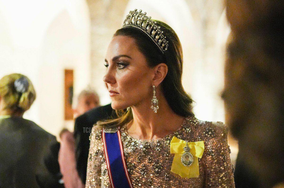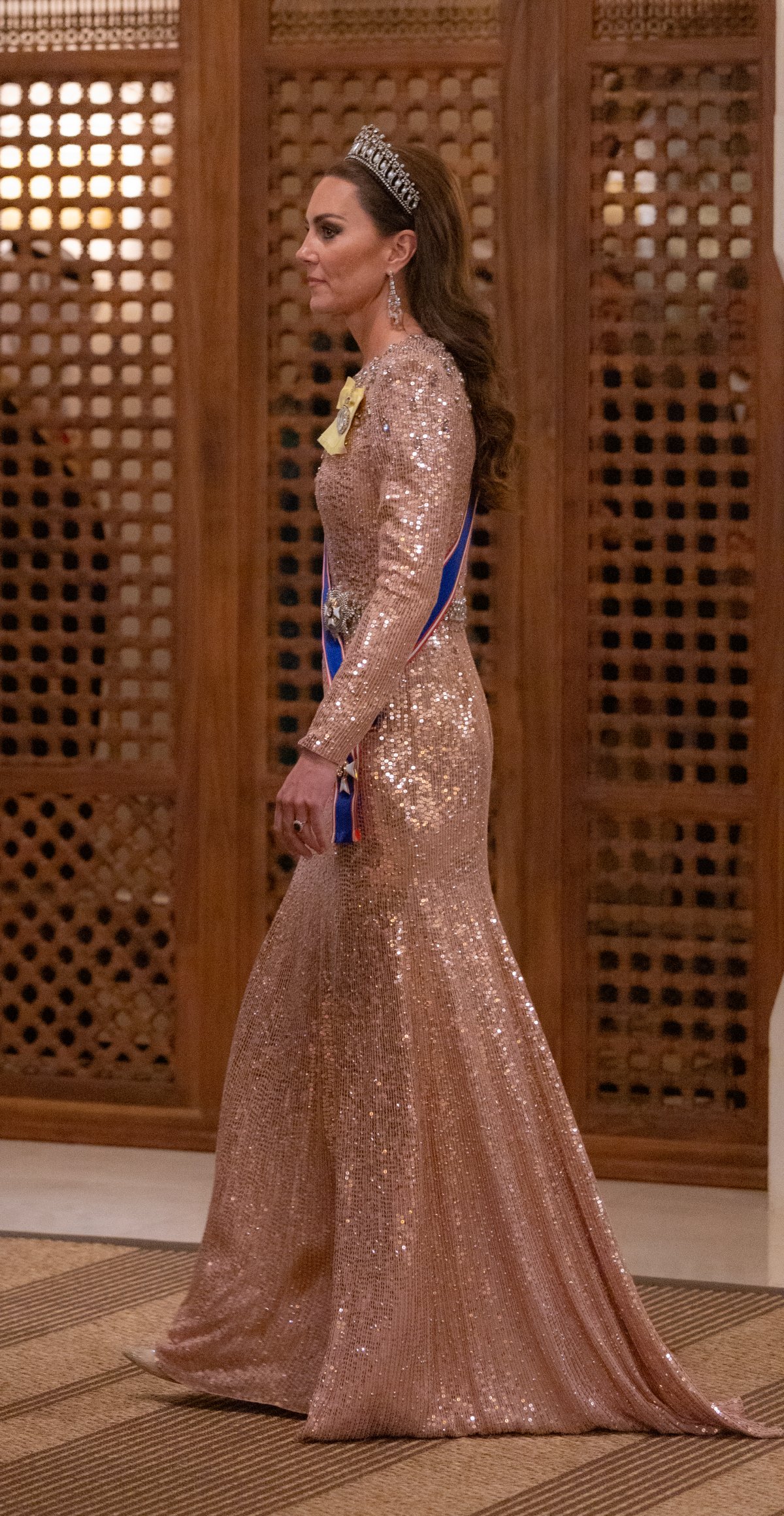 For the banquet, Kate sparkled in a pink sequin gown by Jenny Packham. She pinned the Royal Family Order of the late Queen Elizabeth II, plus the sash and star of the Royal Victorian Order, to the dress for the formal dinner. She secured the order sash with the vintage diamond brooch that she’s been wearing regularly since last November.