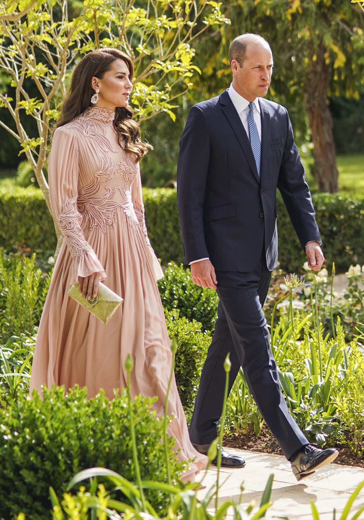 William and Kate were greeted by King Abdullah II and Queen Rania of Jordan on their arrival at Zahran Palace in Amman for the wedding of Crown Prince Hussein and Rajwa Al-Saif.