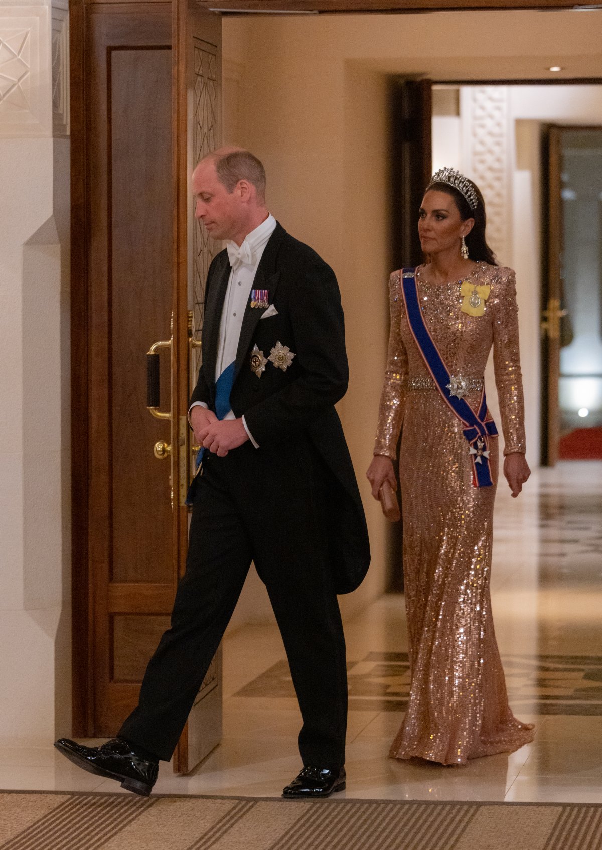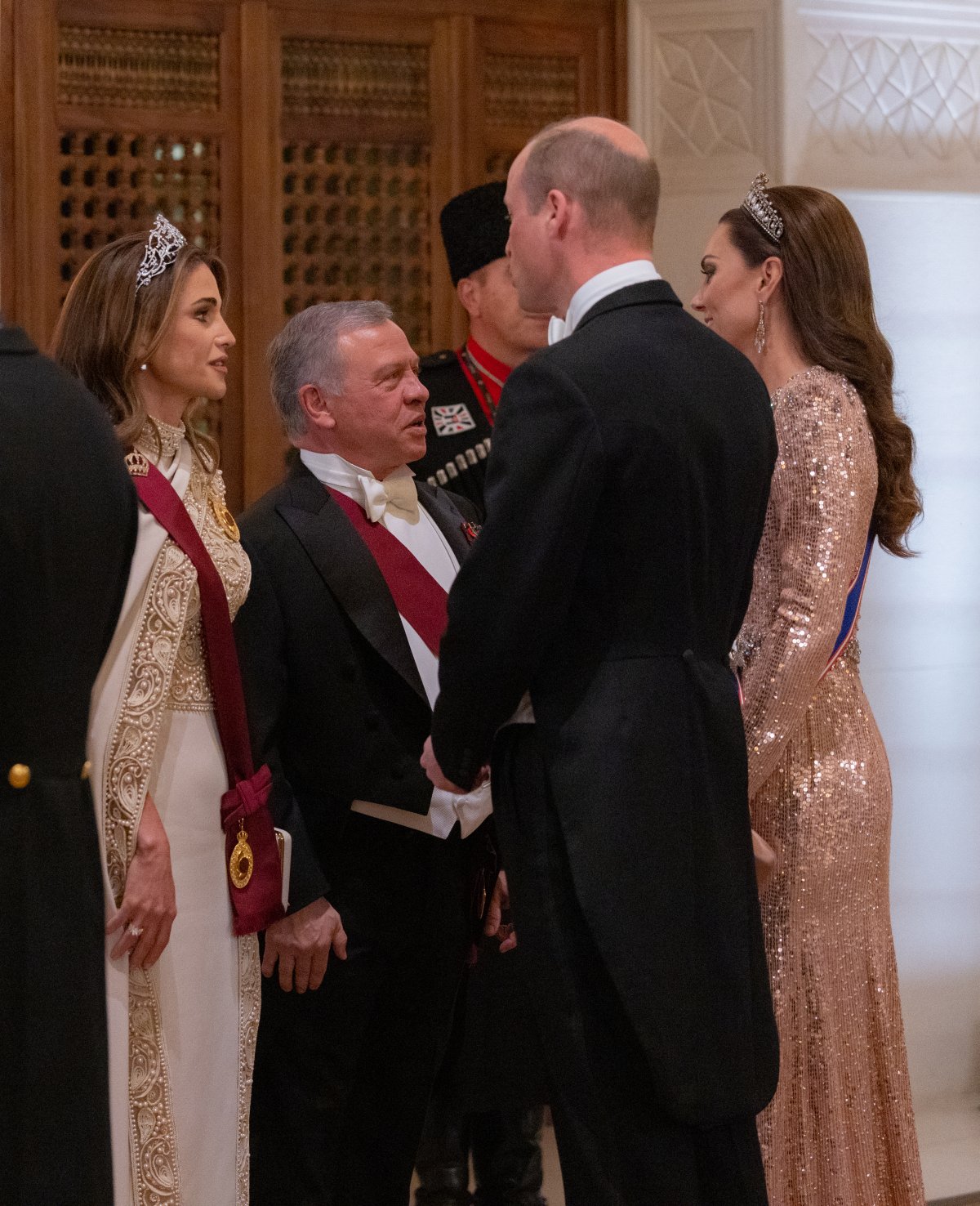 William and Kate chatted again with King Abdullah and Queen Rania on their arrival at the banquet, as well as Crown Prince Hussein and Princess Rajwa.