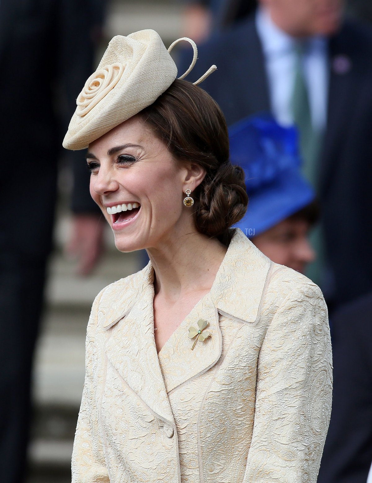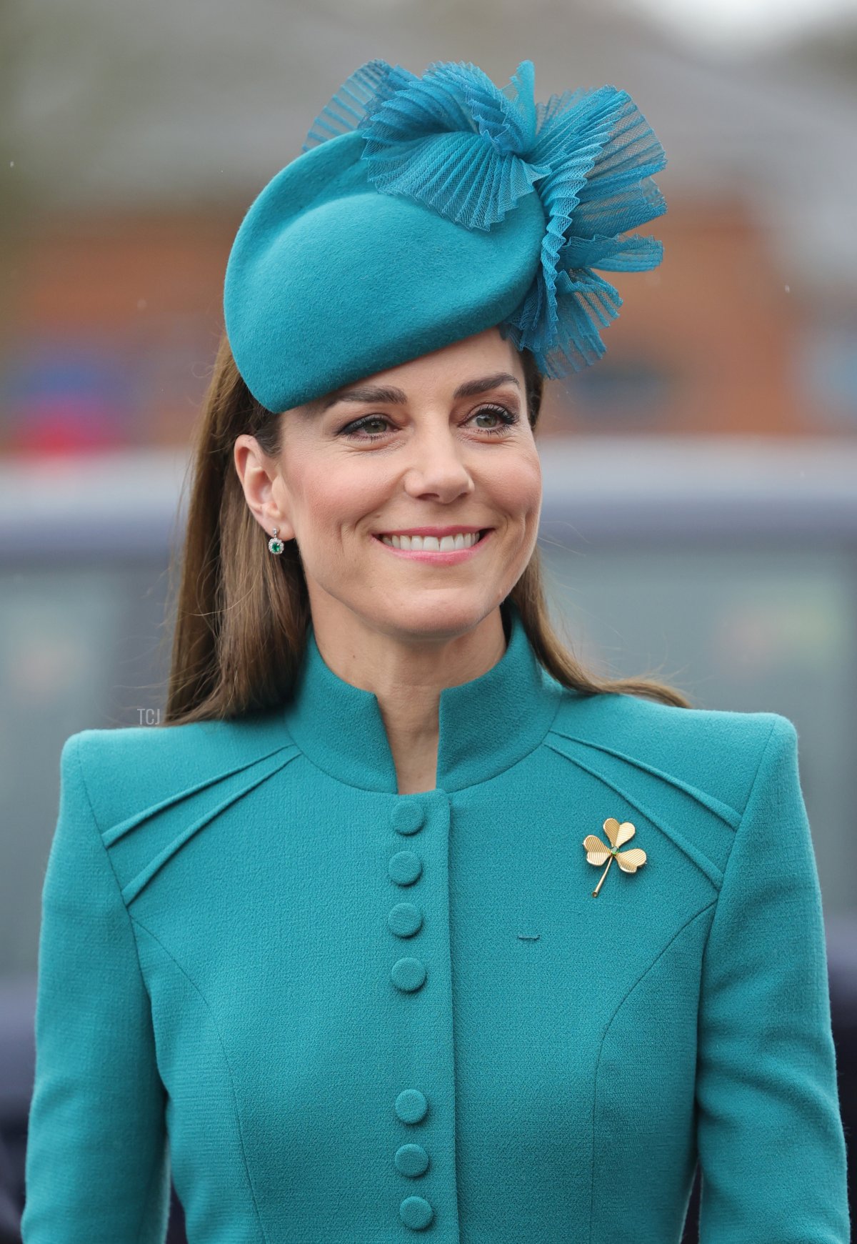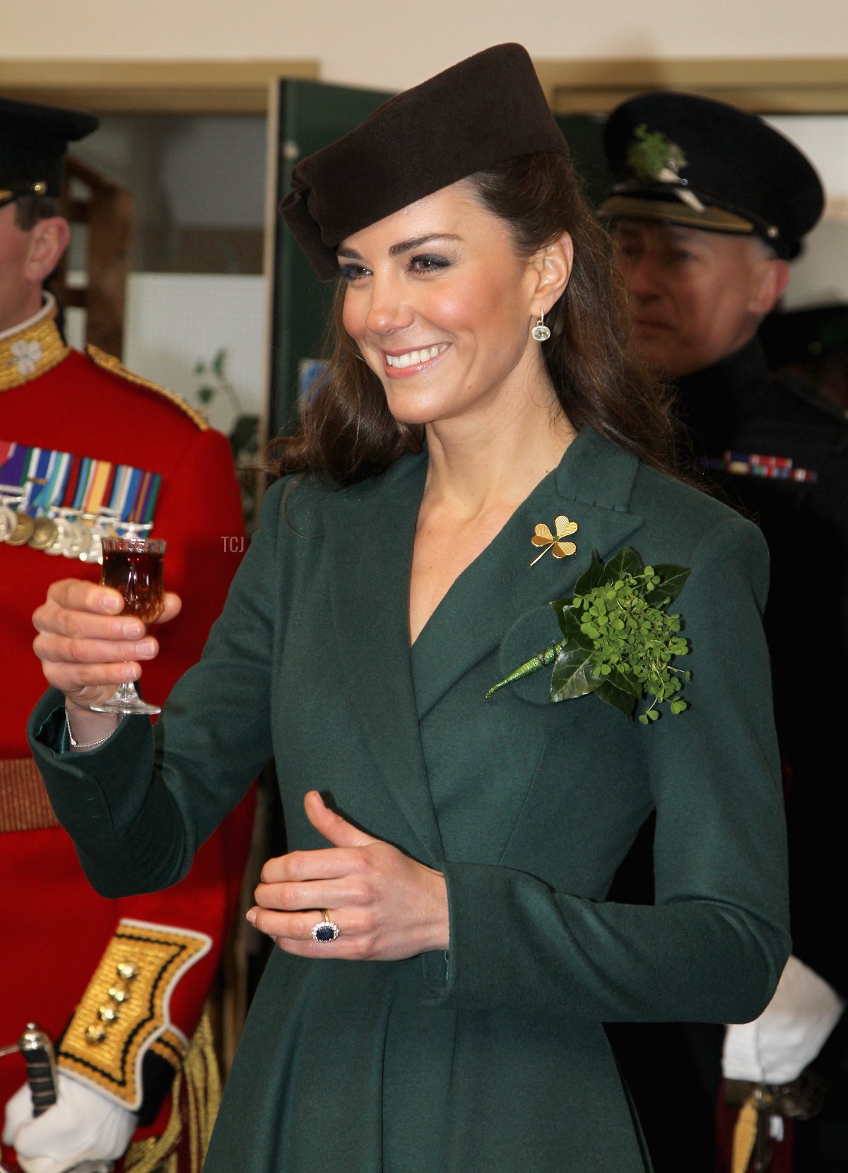 Since then, Kate has worn the brooch almost every year on St. Patrick’s Day, as she helped to present shamrocks to the regiment.