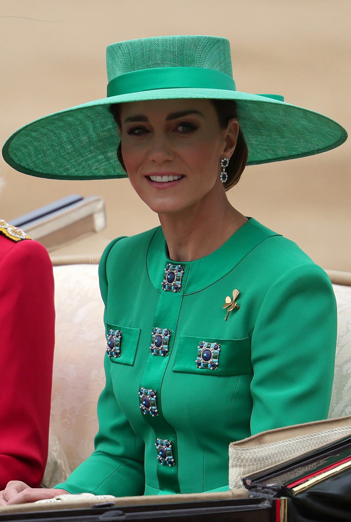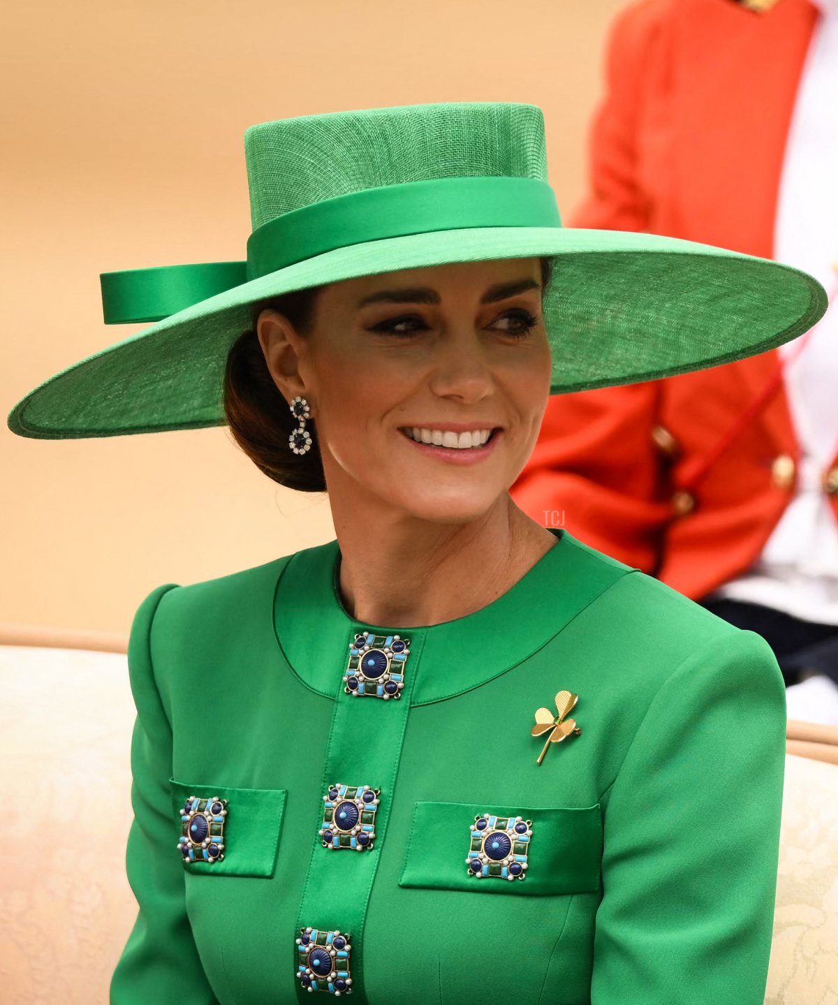 For the first Trooping the Colour celebrations of King Charles’s reign, and her first as colonel of the Irish Guards, Kate wore bright green: an Andrew Gn dress with a coordinating Philip Treacy hat. The brooch-like elements on the dress are part of the garment’s embellishments.