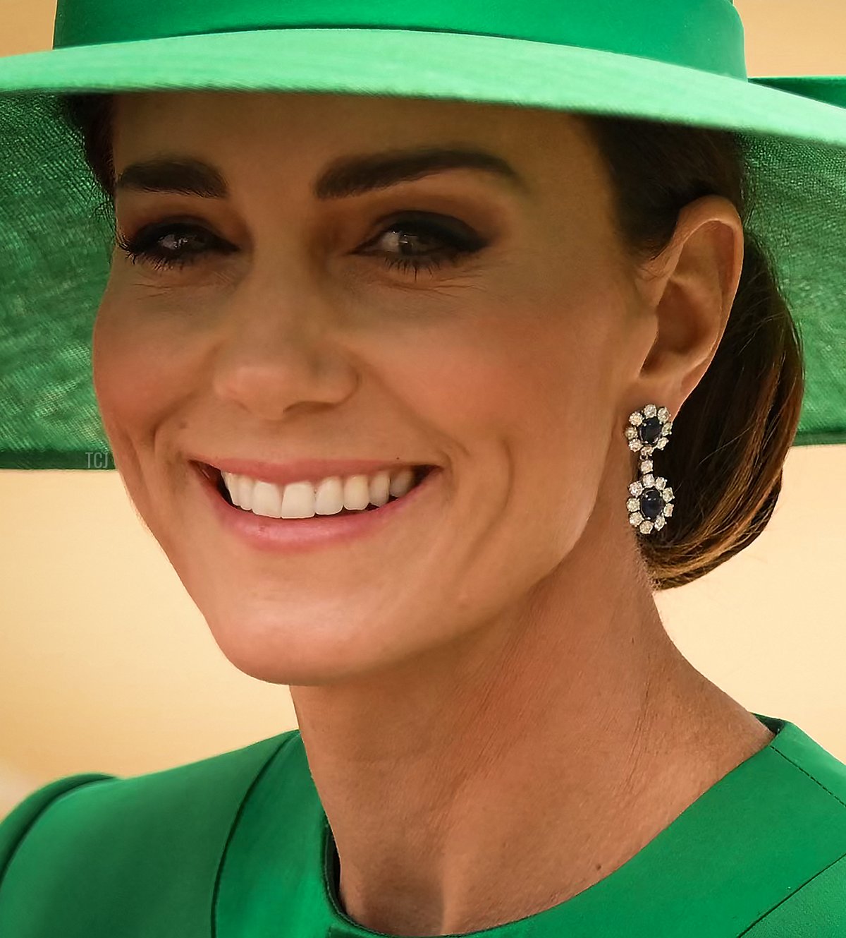 For the first time, Kate watched the colour being trooped from the reviewing stand, alongside Queen Camilla (whose jewels we’ll discuss shortly in another article) and the Duke of Kent.
