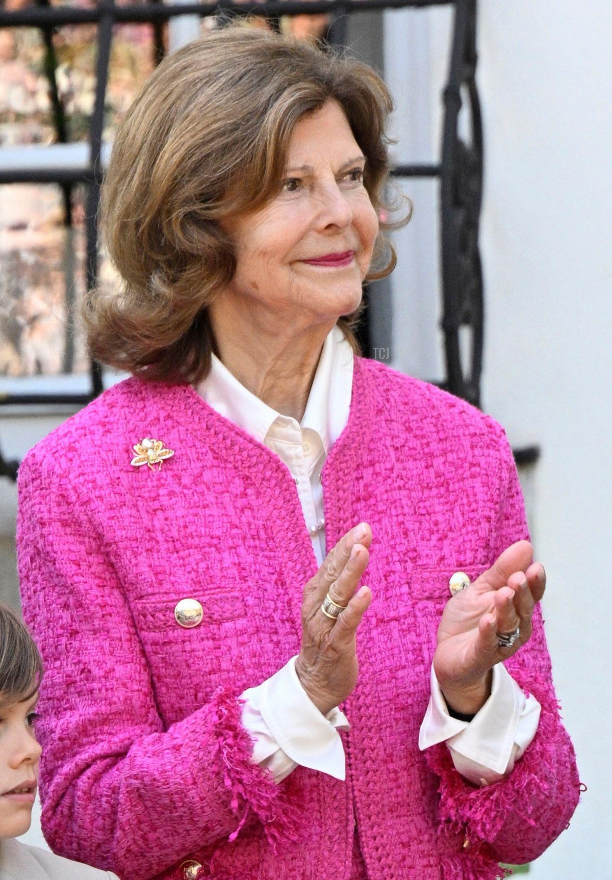 Queen Silvia wore a bright raspberry pink tweed skirt suit for the occasion.