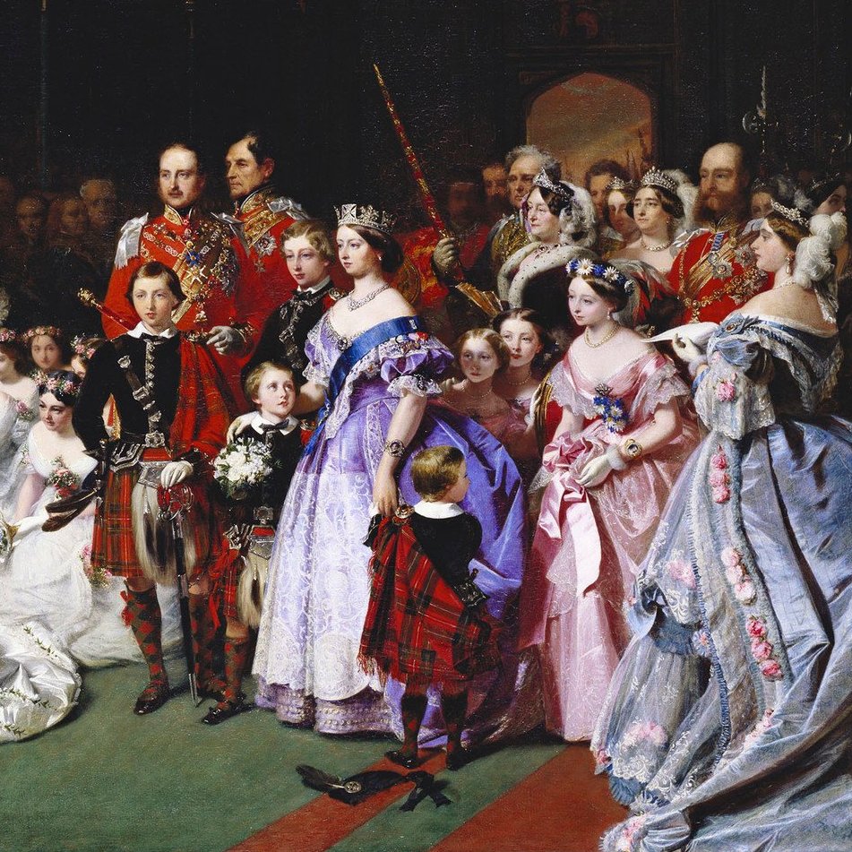 The elder Augusta also wore the lover’s knot tiara in January 1858 for the wedding of the Princess Royal and Prince Friedrich Wilhelm of Prussia. You can spot her wearing the tiara in the family grouping depicted in John Phillip’s painting of the wedding. The Morning Post also mentioned the tiara in their description of her attire for the ceremony: “The Duchess of Cambridge wore a lilac silk dress, with double skirt, both skirts trimmed with bouillonnes of tulle and Honiton lace; the train, lilac moire antique, trimmed with ermine; a stomacher of diamonds and pearls; a necklace of diamonds. Her Royal Highness’s headdress was composed of a tiara of large pearls and white feathers, with a veil of Honiton lace pendant from the back of the head.”