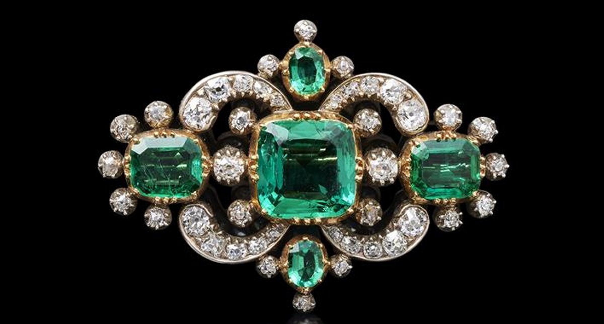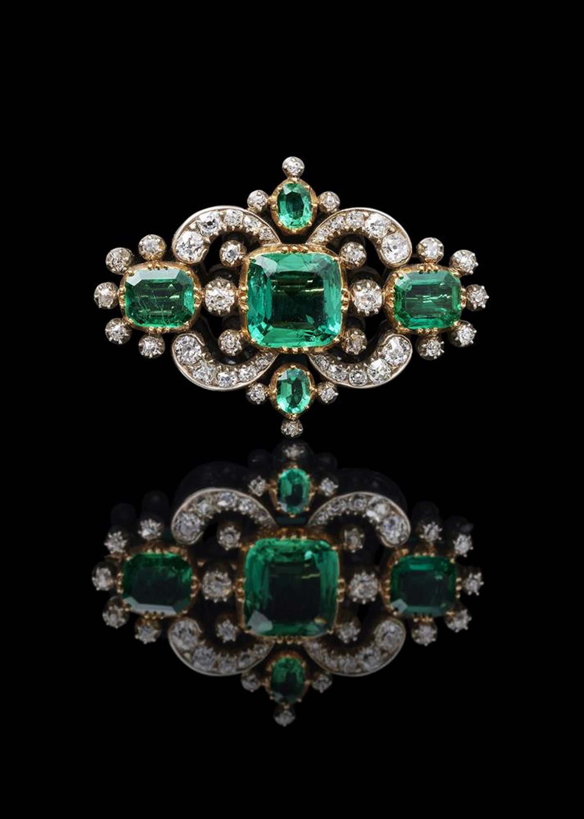 The brooch, which reportedly dates to 1815, is described in the auction notes as “set with a central squared cushion cut emerald estimated to weigh 2.47 carats, with step cut and oval cut emeralds to the cardinal points claw set in gold cut down collets, with old mine cut diamond scrolls and cut down collet set diamond accents, approximately 0.94 carats total, mounted in gold backed silver.”