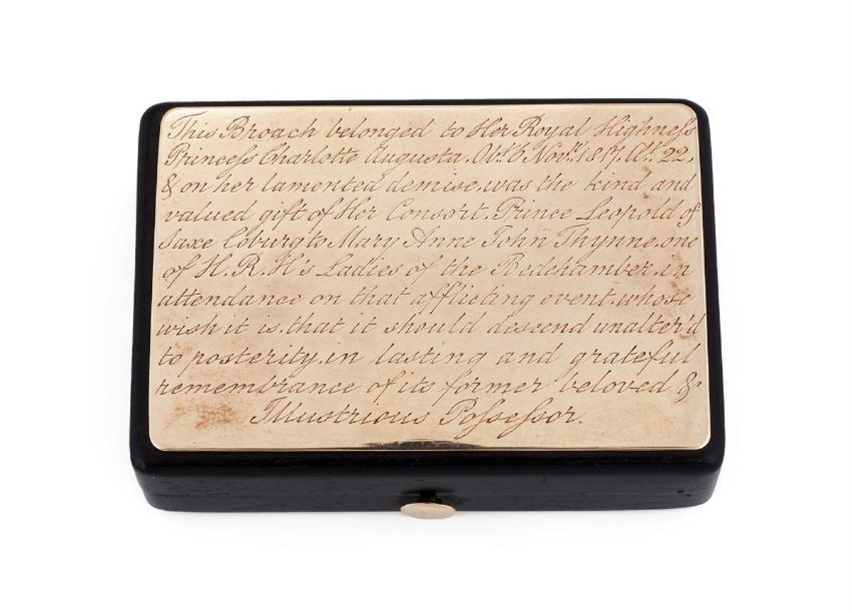 The brooch is being auctioned with a fitted box, the top of which has an engraved message that explains its provenance: “This broach belonged to Her Royal Highness Princess Charlotte Augusta, Obt. [died] 6 Nov 1817 As. [at the age of] 22, & on her lamented demise, was the kind and valued gift of Her Consort, Prince Leopold of Saxe Coburg to Mary Anne John Thynne, one of HRH’s Ladies of the Bedchamber, in attendance on that afflicting event, whose wish it is, that it should descend unalter’d to posterity, in lasting and grateful remembrance of its former beloved & illustrious possessor.” (Note that Charlotte’s age is incorrectly stated on the box—she was a few months shy of her 22nd birthday when she died.)