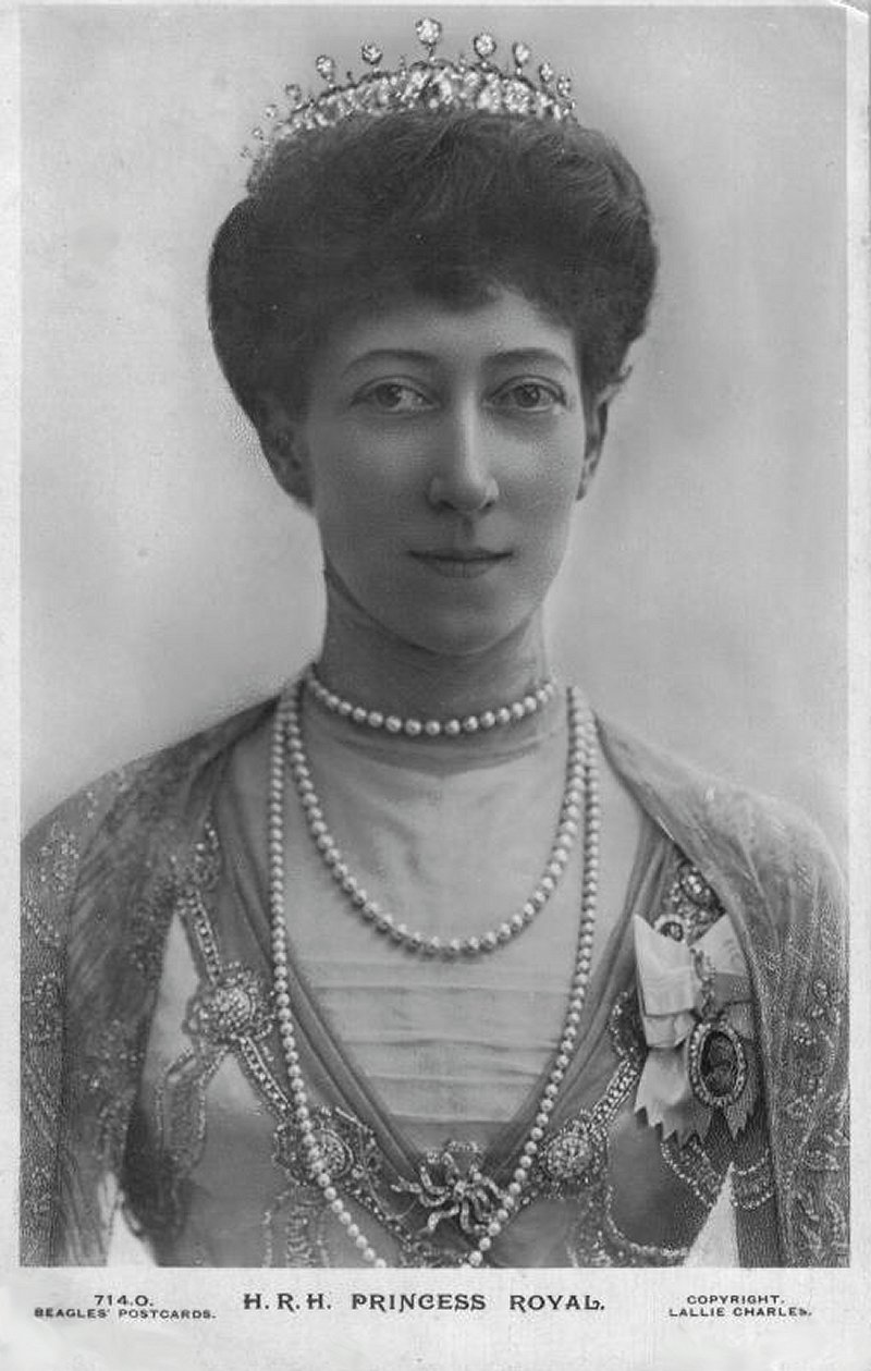 The Morning Post reported, “The Prince and Princess of Wales gave their daughter a magnificent tiara composed of exquisite brilliants set in alternating and graduating rays, nearly two inches in the center to half an inch at the ends; by a simple arrangement it also forms a necklace.” Louise wore the tiara most frequently in its necklace setting. She wore the necklace version, stacked with two diamond necklaces, and the Fife Tiara for the Duke and Duchess of York’s royal wedding in 1893.
