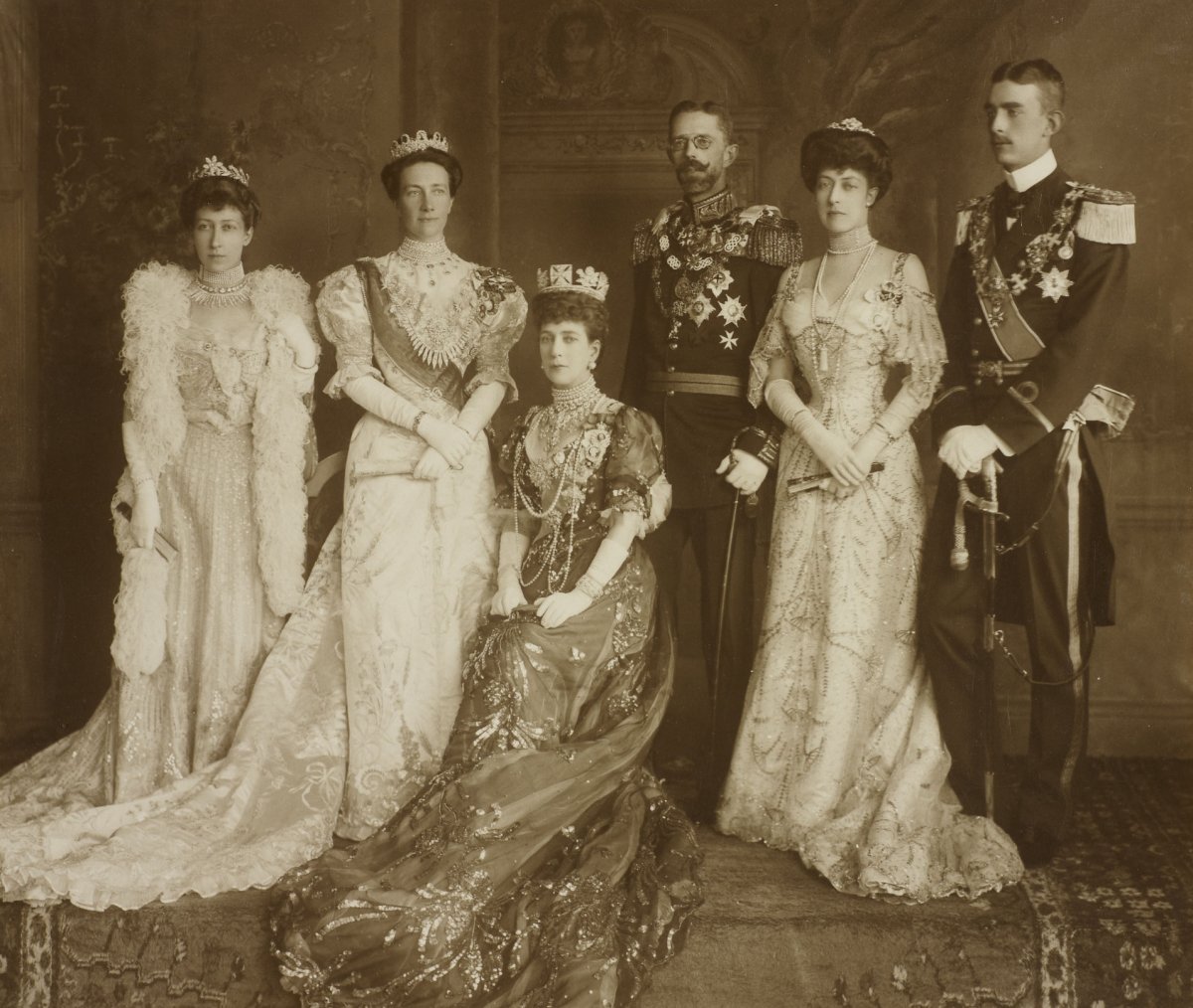 Princess Louise wore the spectacular Fife Tiara for some of the most important family celebrations of the late Victorian and early Edwardian eras. In July 1893, four years after her own royal wedding, she wore the tiara for the marriage of her brother, the Duke of York, and Princess May of Teck (the future King George V and Queen Mary). Louise is pictured above in the tiara during the celebrations with her mother, the Princess of Wales (who wears her diamond kokoshnik tiara), and her sisters, Victoria and Maud, who were bridesmaids at the wedding.