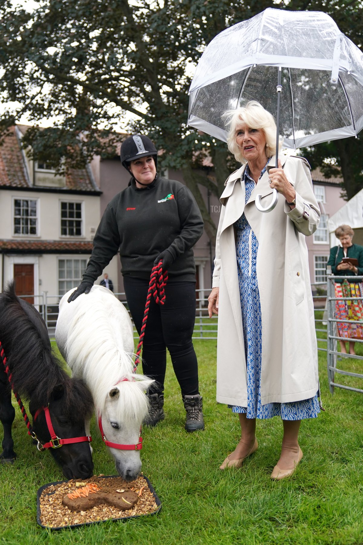 Queen Camilla began her day in Great Yarmouth with a visit to Redwings Horse Sanctuary, a charity that protects and cares for rescued horses.