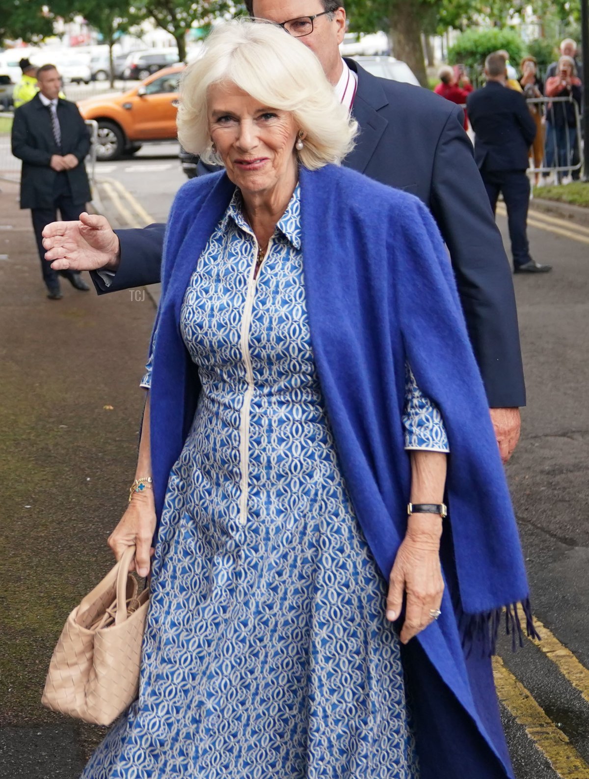 For her day in Norfolk, Queen Camilla wore a blue and white printed day dress with a blue wrap and neutral accessories.